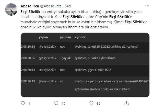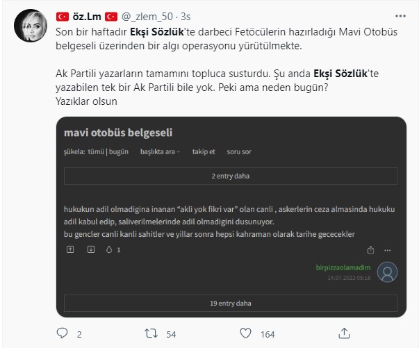 Böyle bir operasyon en son 17-25 Aralık FETÖ kumpası döneminde yapılmıştı. O dönemde FETÖ iddialarına cevap verilememesi için Ekşi Sözlük bütün AK Partili yazarları aynı anda uçurmuş ve yalanların rahat şekilde yayılabilmesini sağlamıştı.