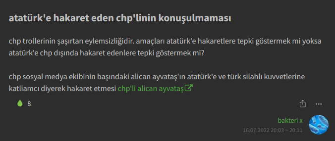 Sözlükte zaten azınlık durumunda olan AK Partili yazarların tamamı susturulmuş durumda. 100'e yakın hesap askıya alındı. CHP'nin operasyonlarına cevap verebilecek hiç kimse bırakılmadı ve arka arkaya yeni yalan ve iftiralar gündeme sokuluyor.