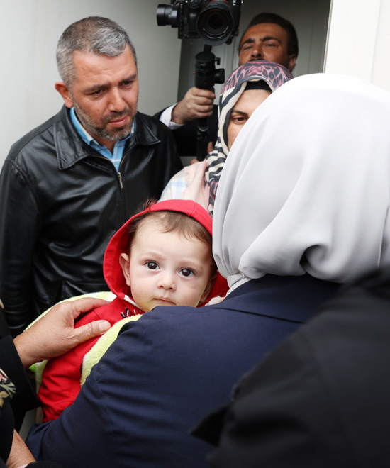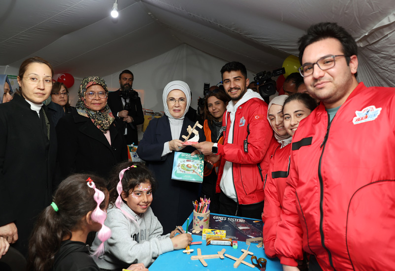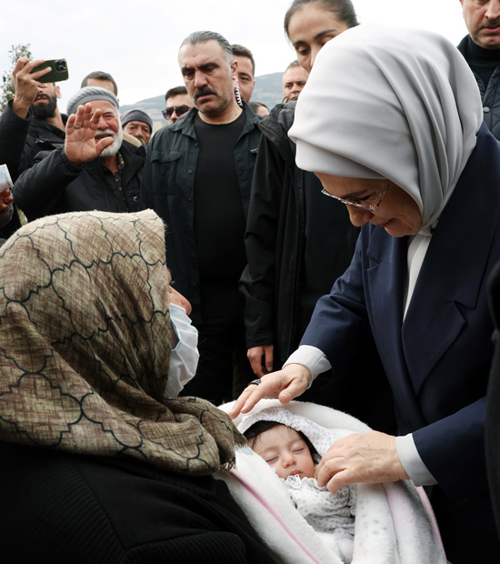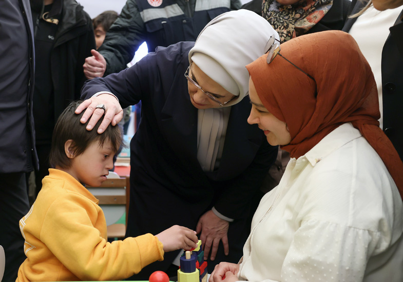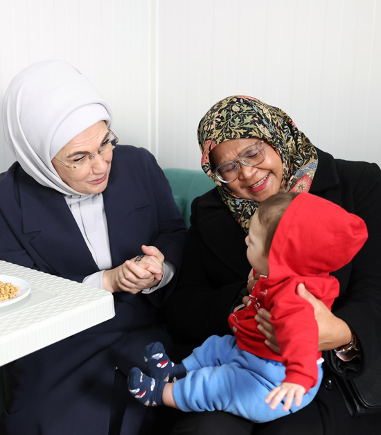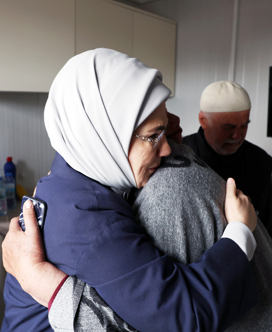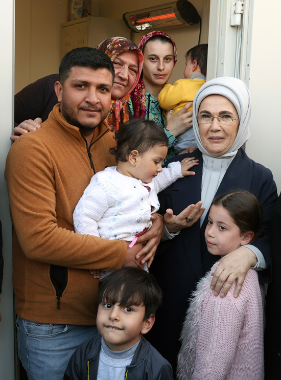 Nurdağı'nda "Tek Yürek Türkiye" olarak adlandırılan meydanda kurulu tam donanımlı konteyner kenti ziyaret eden Emine Erdoğan ve Sharif, burada depremzede ailelerle görüştü.