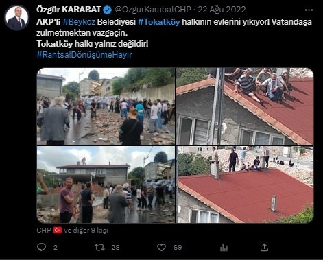 CHP'li Özgür Karabat, Beykoz'daki kentsel dönüşüme Twitter'dan tepki göstererek, "AK Partili Beykoz Belediyesi Tokatköy halkının evlerini yıkıyor. Vatandaşa zulmetmekten vazgeçin Tokatköy hakı yalnız değildir." şeklinde provokatif ve halkı galeyana getirecek ifadeler kullandı.