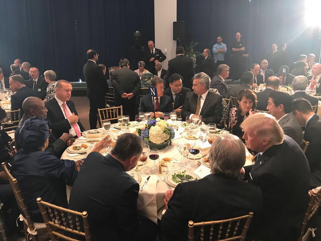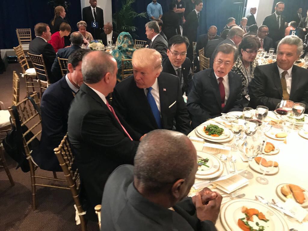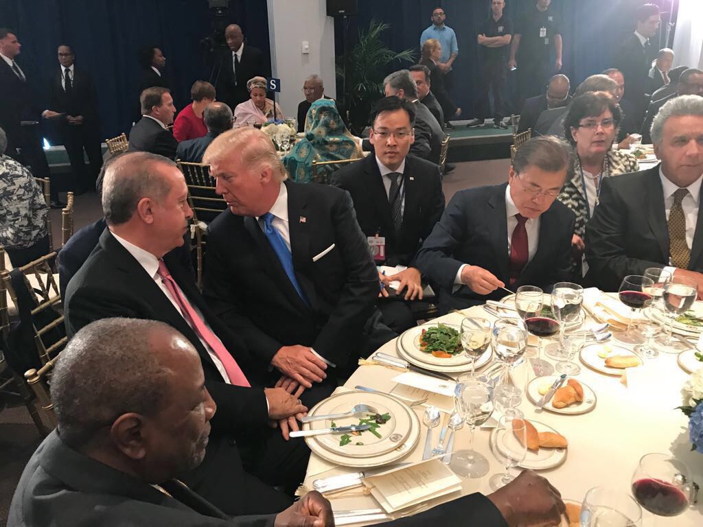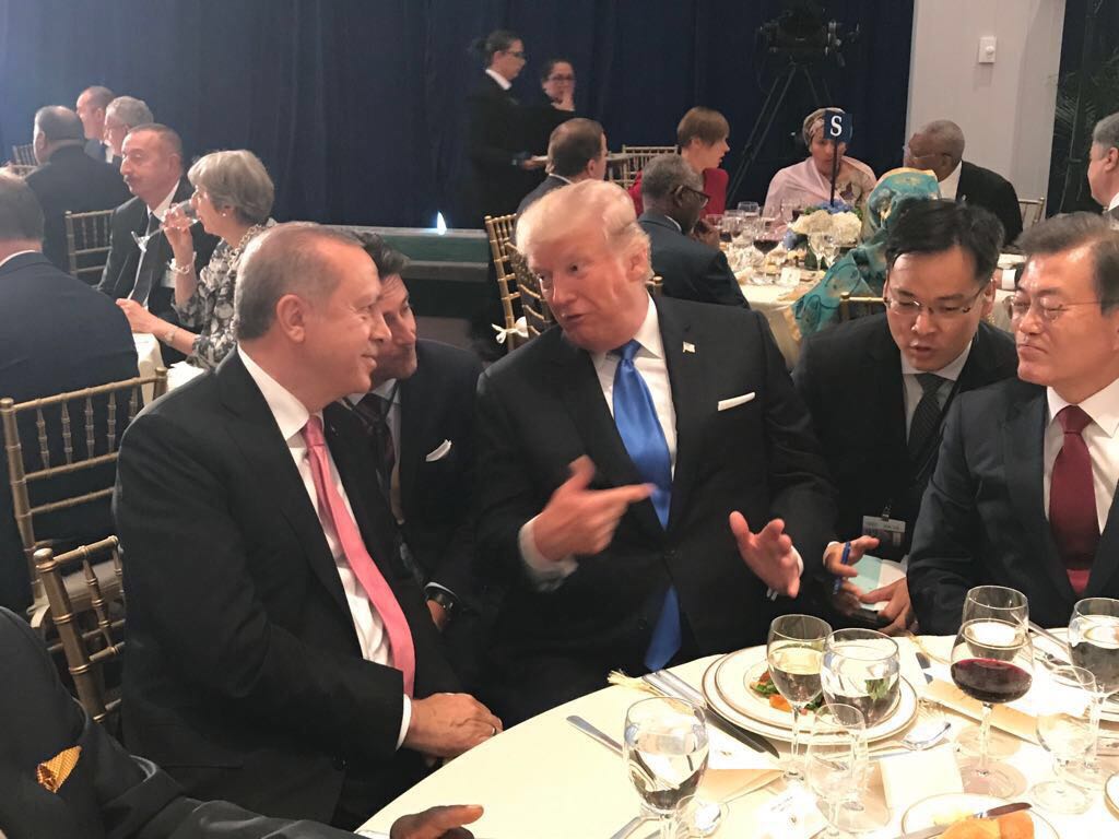 Cumhurbaşkanı Recep Tayyip Erdoğan, Birleşmiş Milletler (BM) 72. Genel Kurulunda heyet başkanları onuruna verilen yemekte ABD Başkanı Donald Trump ile bir süre sohbet etti.