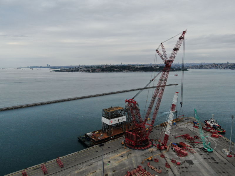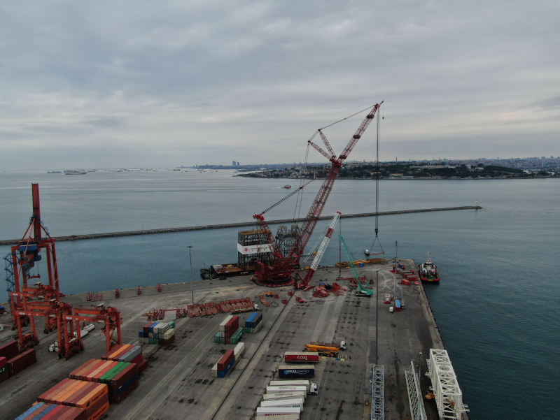 Haydarpaşa Limanı'nda bağlı olan geminin yanına getirilerek kurulan geminin üzerindeki platform söküm çalışmaları bir süredir dev vinç yardımıyla devam ediyordu.