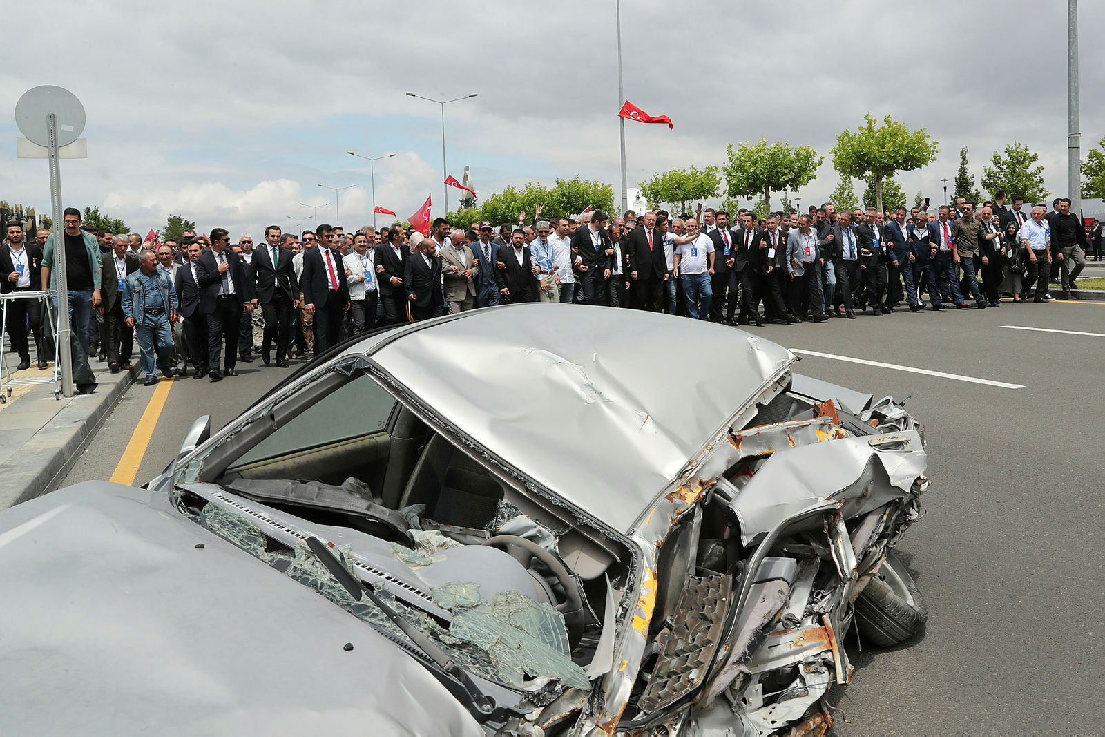 Yürüyüş güzergahında, 15 Temmuz darbe girişiminde FETÖ'cü pilotlar tarafından atılan bombalarla parçalanan araçlar sıralandı.