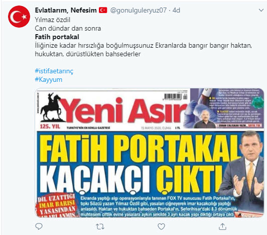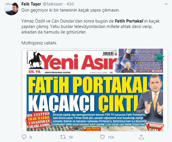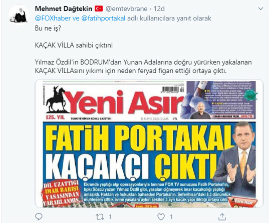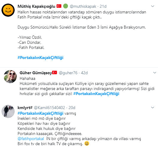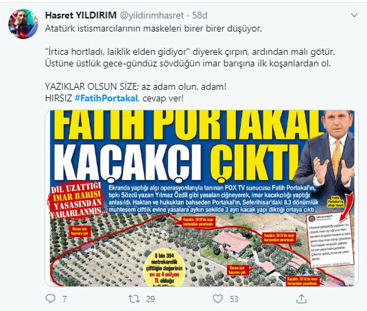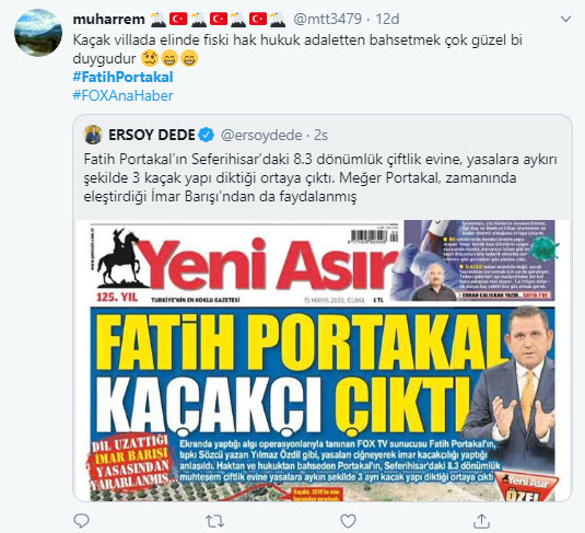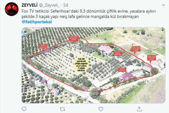 FOX TV sunucusu Fatih Portakal'ın İzmir Seferihisar'daki 8.3 dönümlük milyonluk çiftliğinde yasalara aykırı şekilde 3 yapı olduğu ortaya çıktı. Bu haber sonrası vatandaşlar ABD menşeili FOX TV ekranlarından her seferinde ahlak ve etik dersi veren sunucu Fatih Portakal'ın ikiyüzlülüğüne sosyal medyadan çok ağır tepki gösterdi.