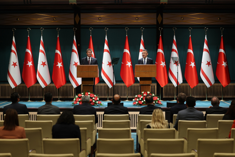 Cumhurbaşkanı Yardımcısı Oktay ve Kuzey Kıbrıs Türk Cumhuriyeti Başbakanı Ünal Üstel, ikili ve kurullar arası müzakerelerin akabinde Cumhurbaşkanlığı Külliyesi'nde ortak basın açıklamasında bulundu.