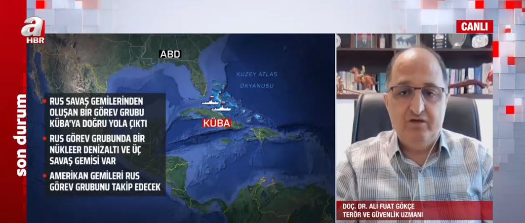 Rus donanmasının Kuzey Filosu'ndan 4 gemi, dün itibariyle Küba'ya ulaştı. Rus donanması Küba'da tatbikat yapacak. Savaş çıkar mı? Soğuk Savaş dönemine geri mi dönüldü? Terör ve Güvenlik Uzmanı Doç. Dr. Ali Fuat Gökçe, A Haber canlı yayınında konu ile ilgili değerlendirmelerde bulundu.