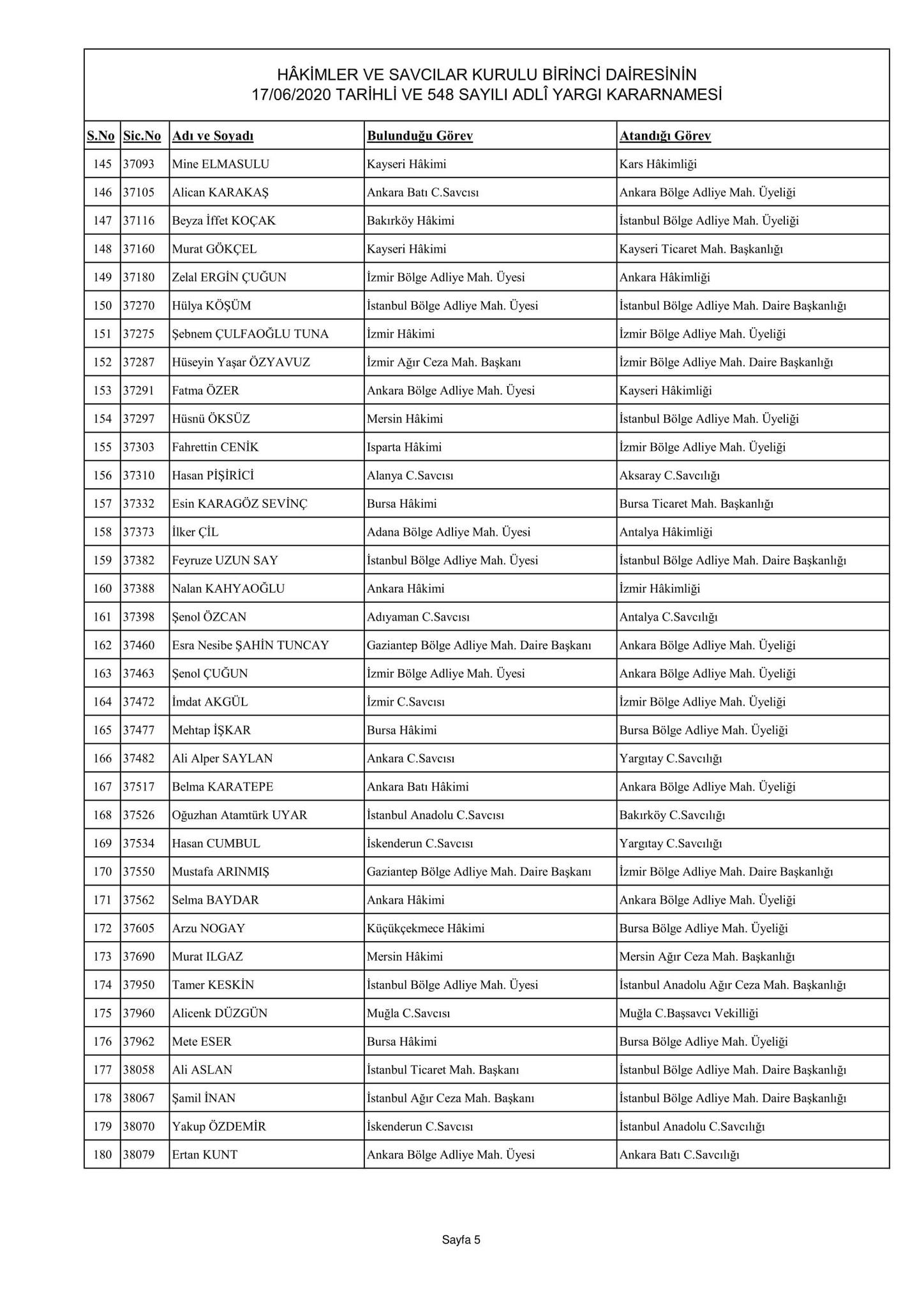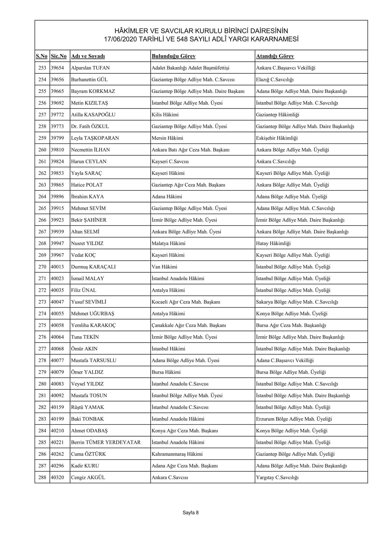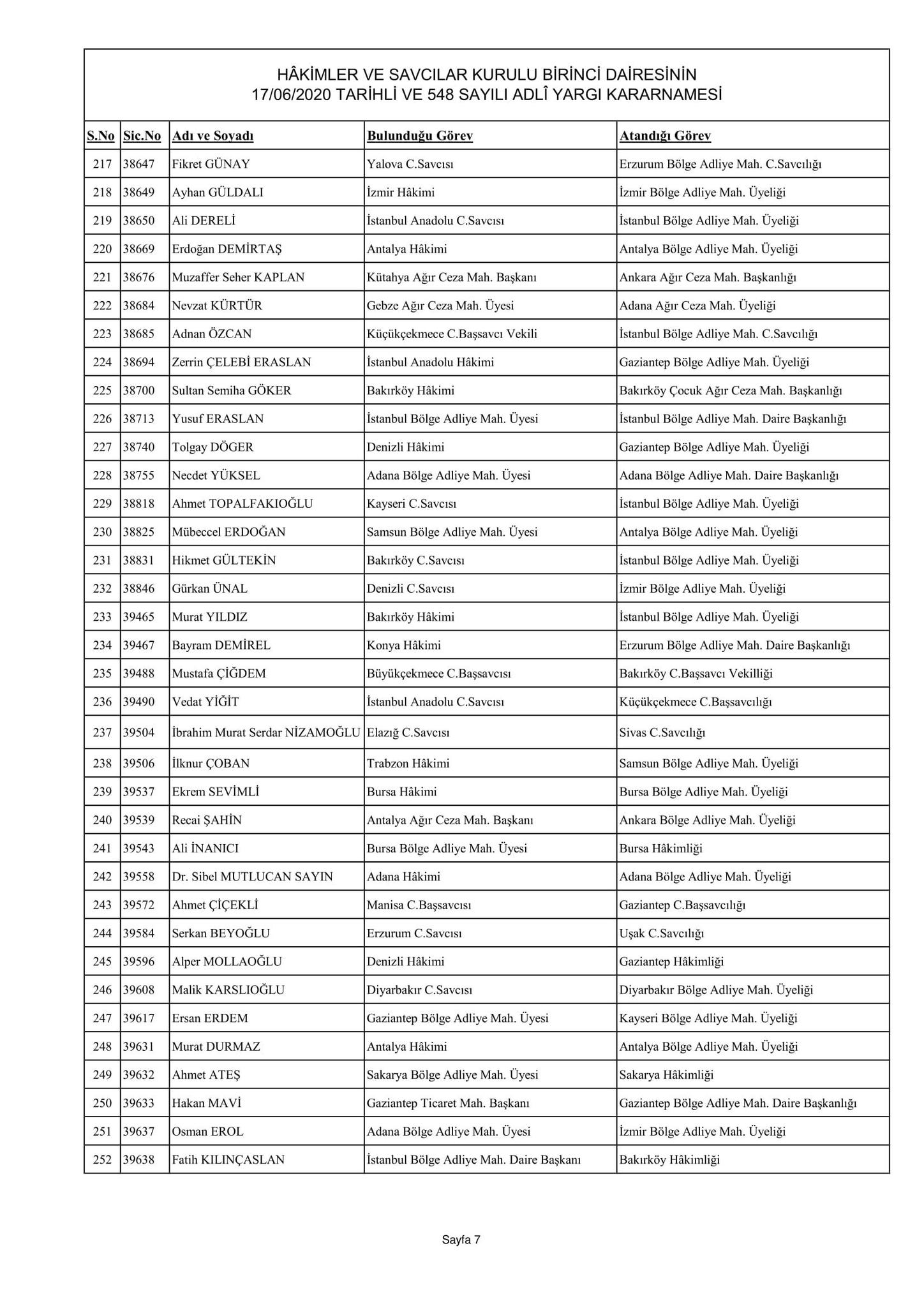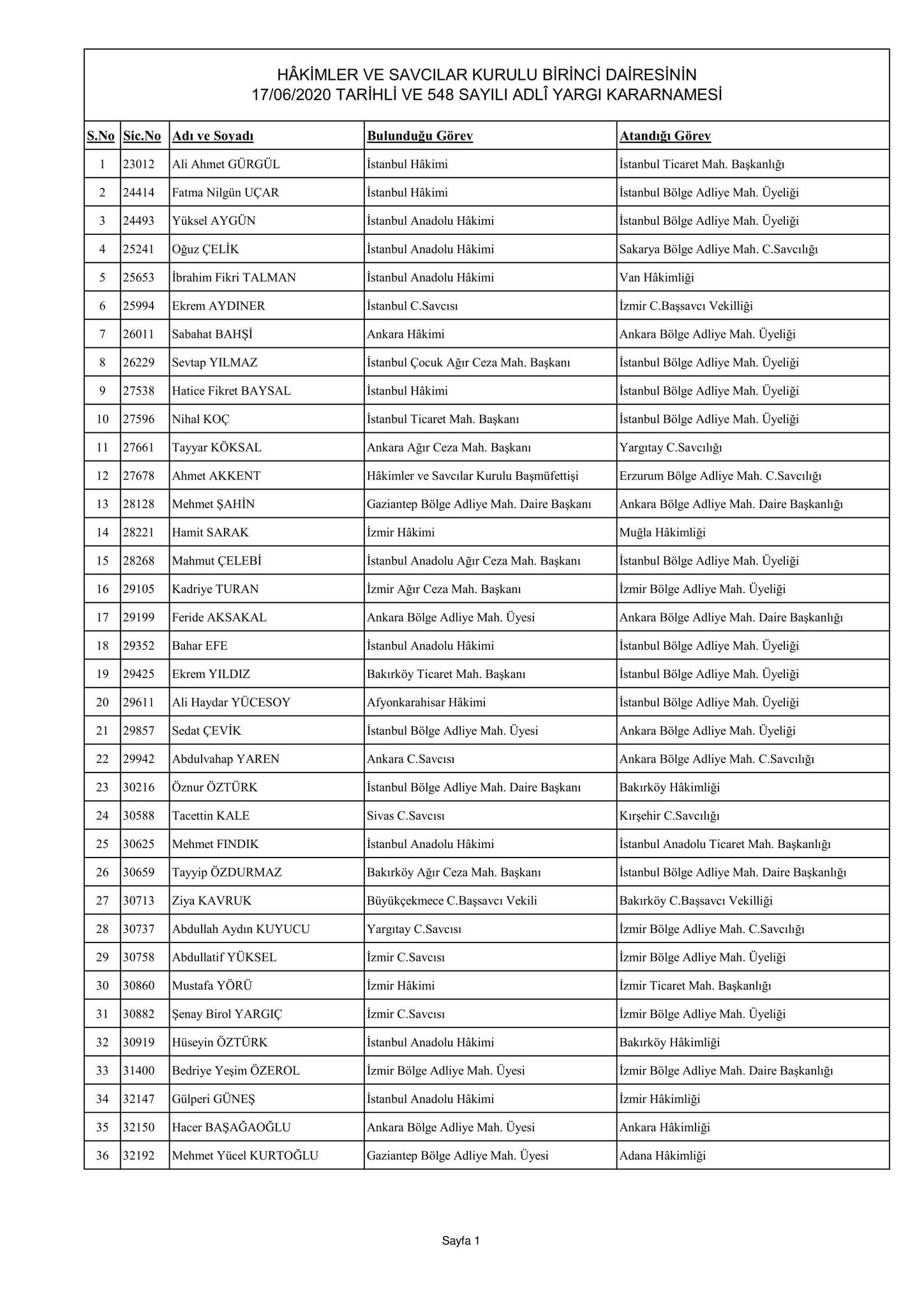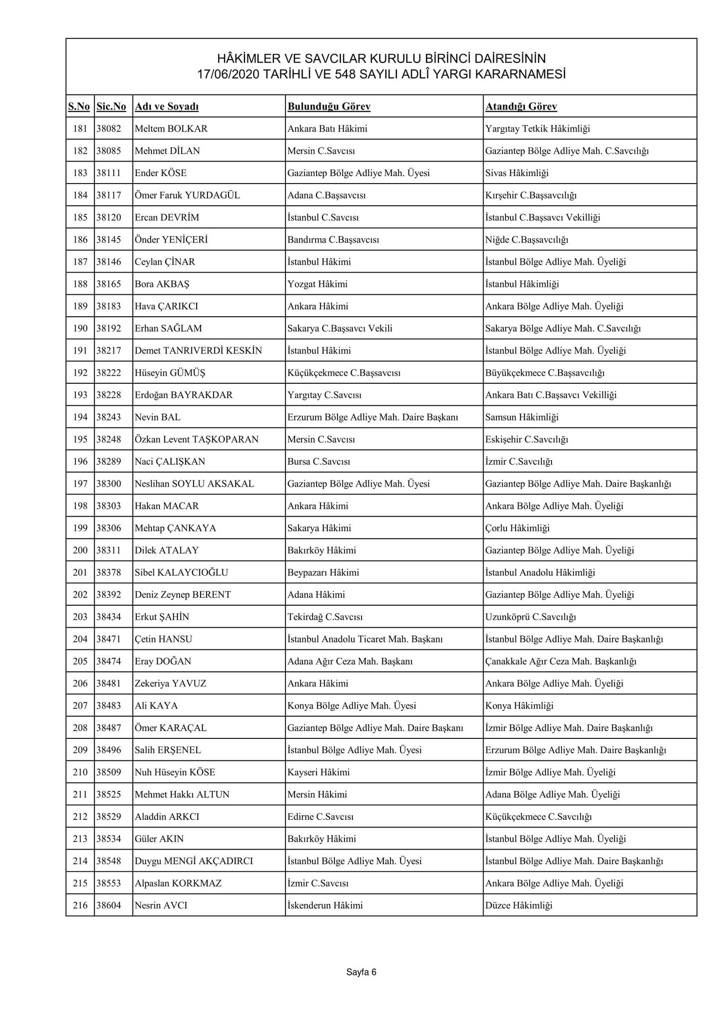 Hakimler ve Savcılar Kurulu birinci dairesinin 17/06/2020 tarihli ve 548 sayılı adli yargı kararnamesi
