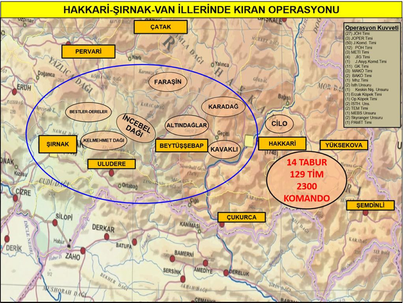 Jandarma Genel Komutanı Orgeneral Arif Çetin'in komutasında Hakkari, Şırnak ve Van'da terör örgütüne yönelik jandarma, emniyet birimleri ve güvenlik korucularının katılımıyla "Kıran" operasyonu başlatıldı.