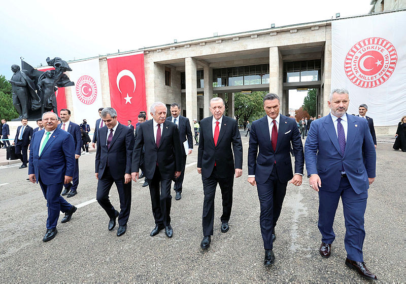 TBMM Başkanvekili Celal Adan tarafından resmi törenle karşılanan Başkan Erdoğan, Cumhurbaşkanlığı Tören Birliği kıtasını selamladıktan sonra TBMM Başkanı Numan Kurtulmuş ile Genel Kurul salonuna geçti.