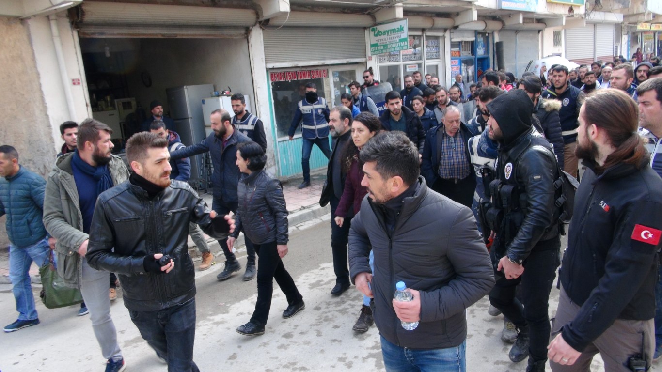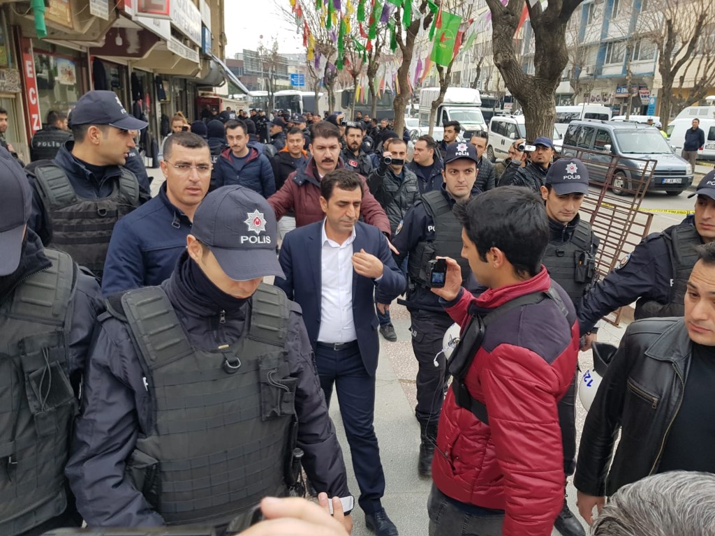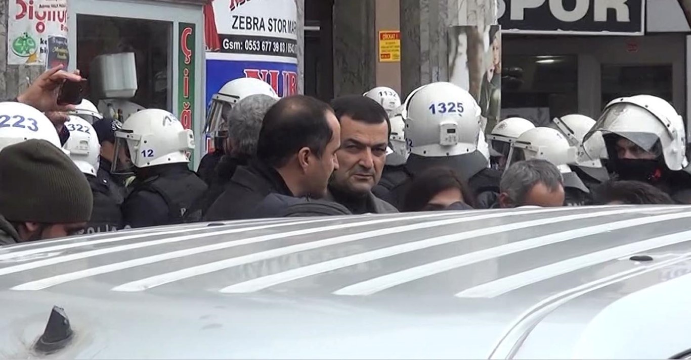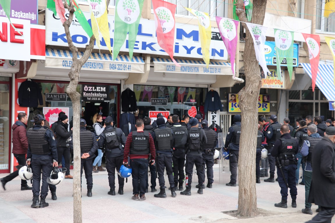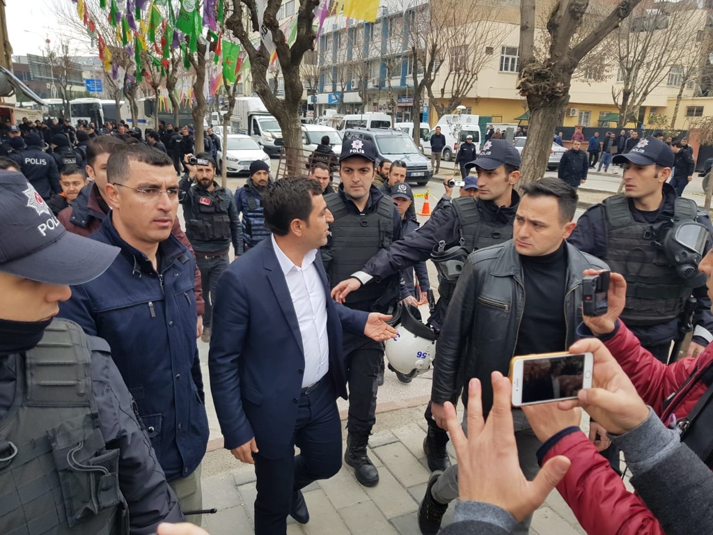 Daha sonra milletvekilleri, üzerinde Milletvekili Leyla Güven'in fotoğraflarının olduğu önlükleri giyerek yürüyüş yapmak istedi. HDP ilçe binası önünde güvenlik önlemleri alan polis ekipleri milletvekillerin yürüyüş için parti binasından çıkmalarına izin vermedi.