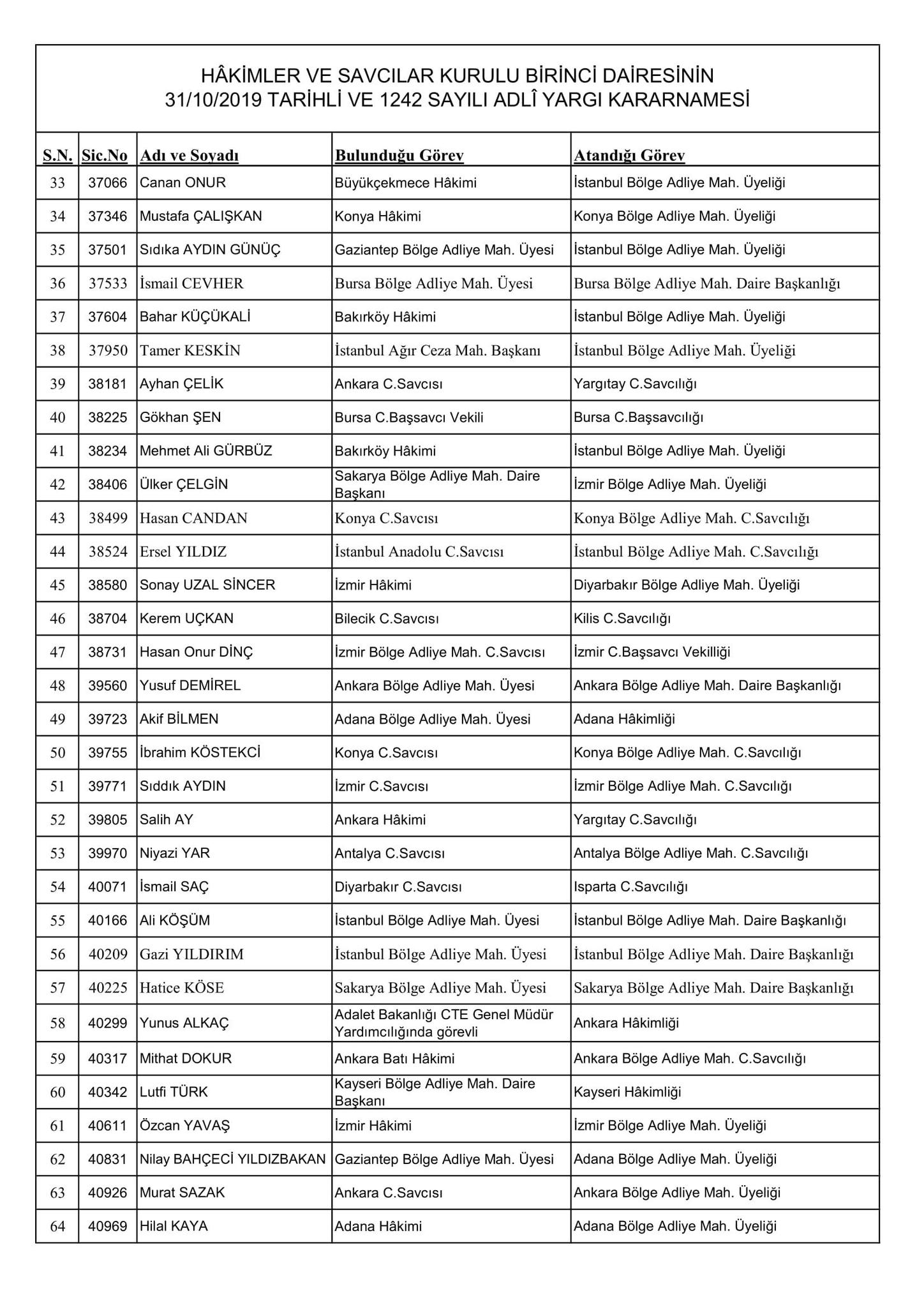 Bursa C.umhuriyet Başsavcılığı'na aynı adliyenin Başsavcı Vekili Gökhan Şen atandı. İzmir Bölge Adliye Mahkemesi Başkanlığı'na ise İdris Kiziroğlu getirildi.
