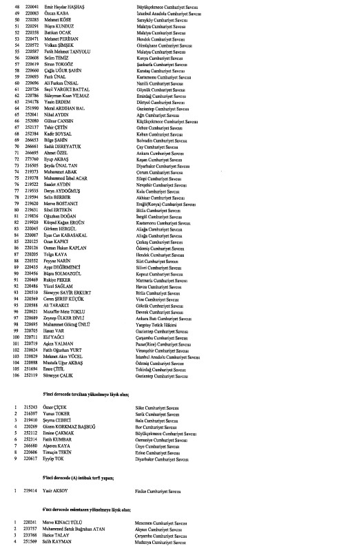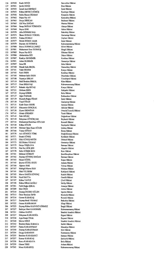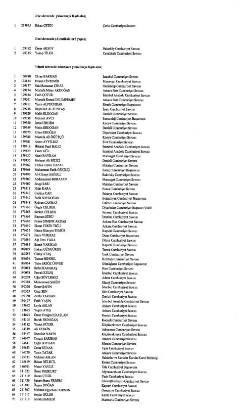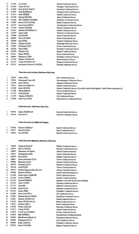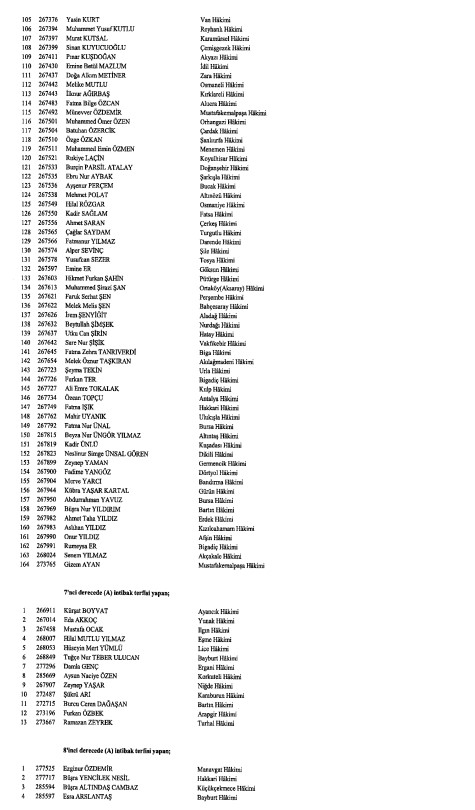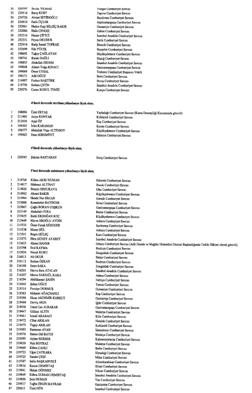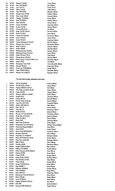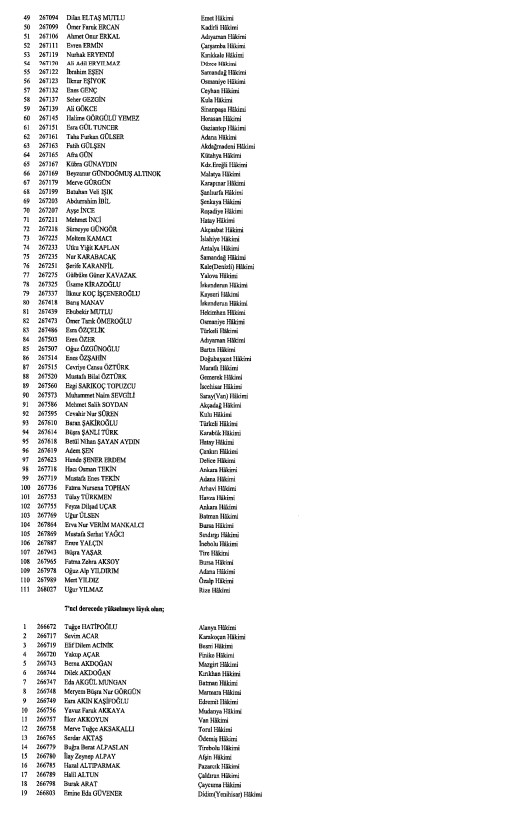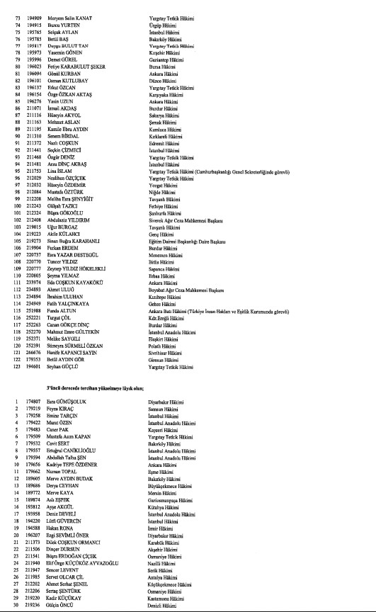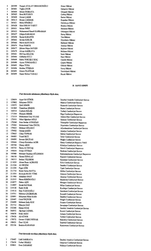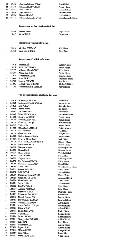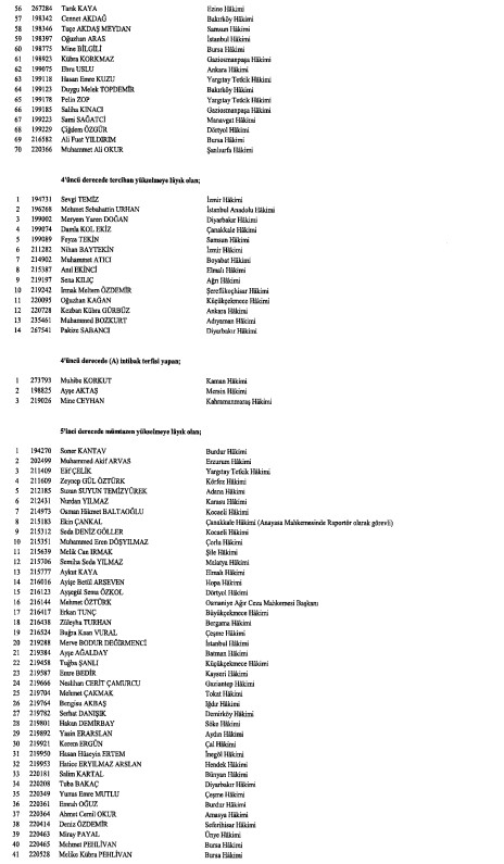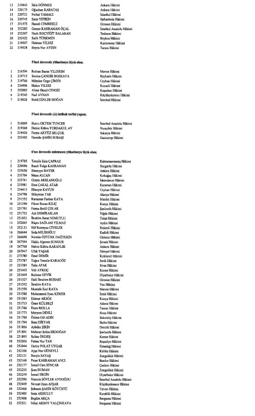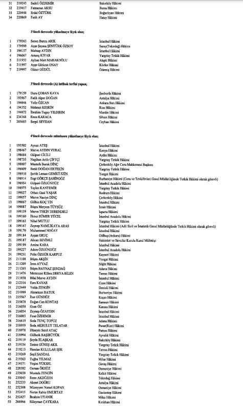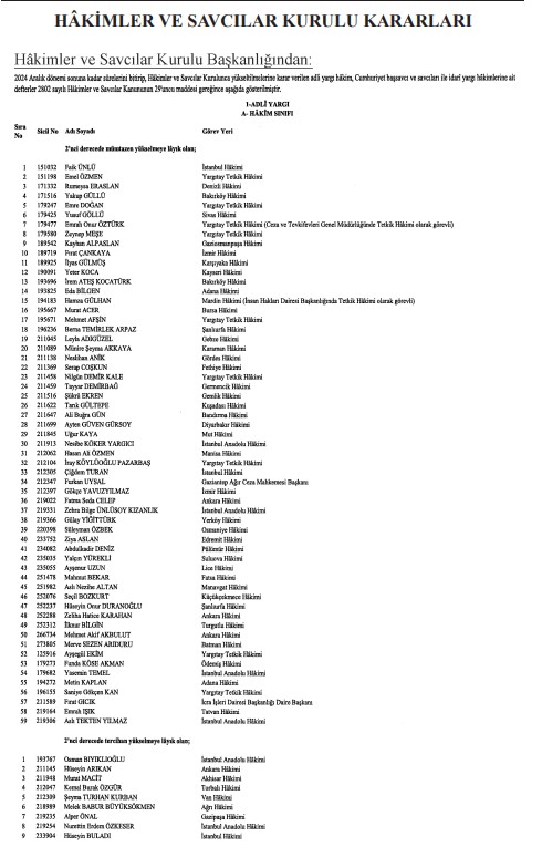 Hakimler ve Savcılar Kurulunca (HSK), çeşitli derecelerdeki görev sürelerini tamamlayan adli yargı hakimi, Cumhuriyet başsavcısı ve savcıları ile idari yargı hakimlerine ilişkin karar Resmi Gazete'de yayımlandı. HSK kararlarında, birinci dereceye yükselip 31 Aralık 2024'ten itibaren geçerli olmak üzere ilk defa birinci sınıfa ayrılma incelemesine tabi tutulan adli ve idari yargı hakimleri ile cumhuriyet başsavcı ve savcılarının isimlerinden oluşan listelere yer verildi.İşte o liste...