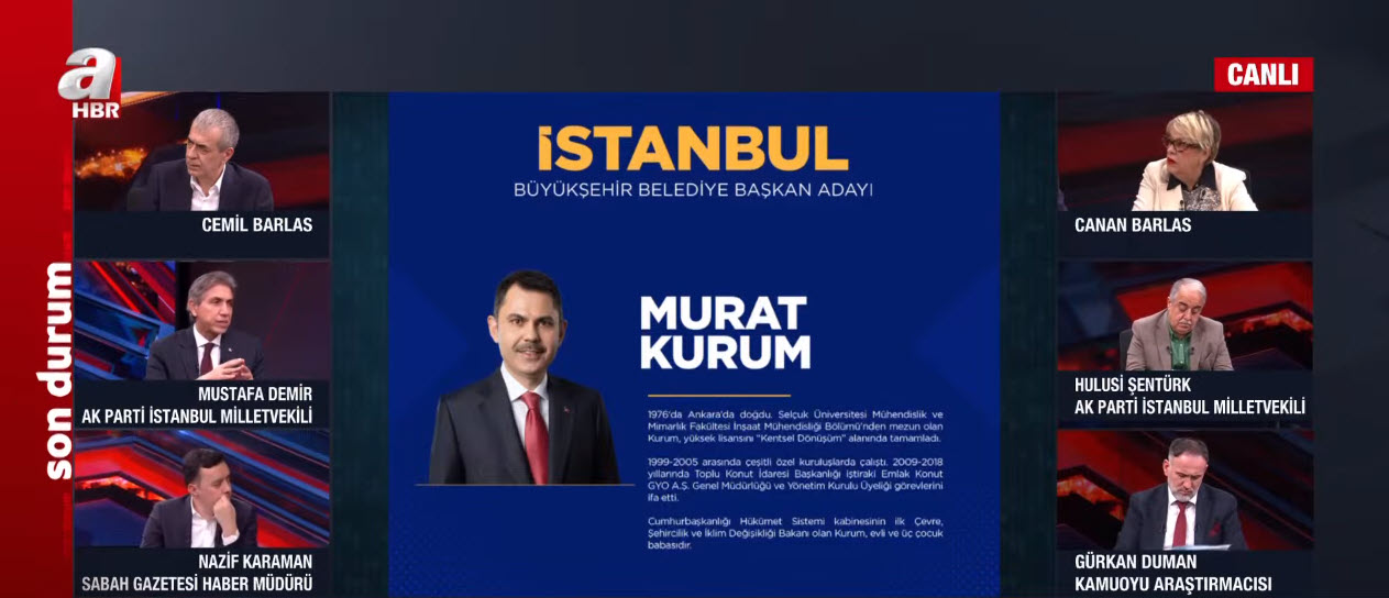 AK Parti İstanbul adayı Murat Kurum oldu. Son anketler ne diyor? Kamuoyu Araştırmacısı Gürkan Duman, A Haber canlı yayınında verileri paylaştı. AK Parti İstanbul Milletvekili Mustafa Demir, AK Parti İstanbul Milletvekili Hulusi Şentürk ve Akşam Gazeteci Yazarı Kurtuluş Tayiz konu ile ilgili önemli değerlendirmelerde bulundu.