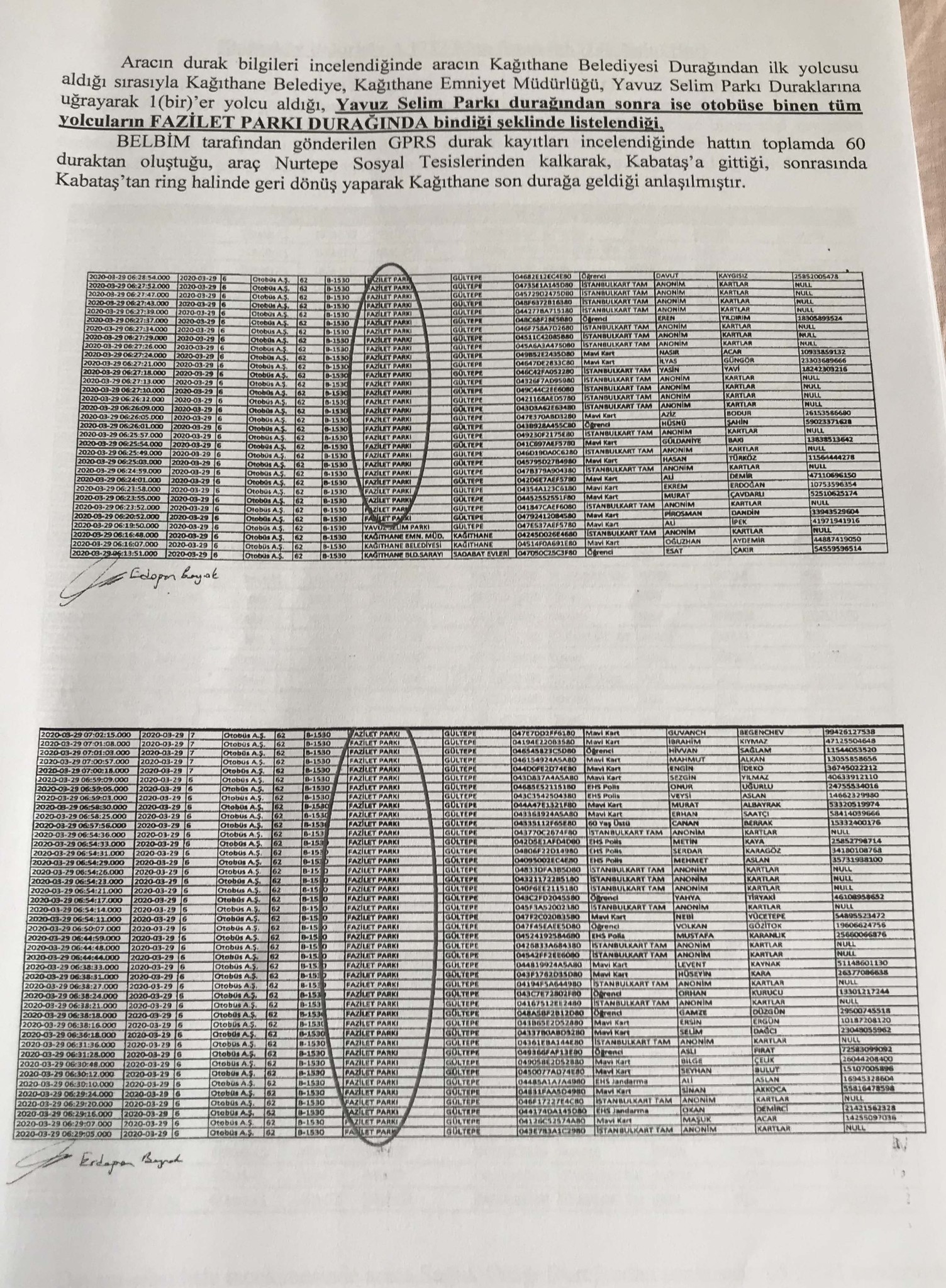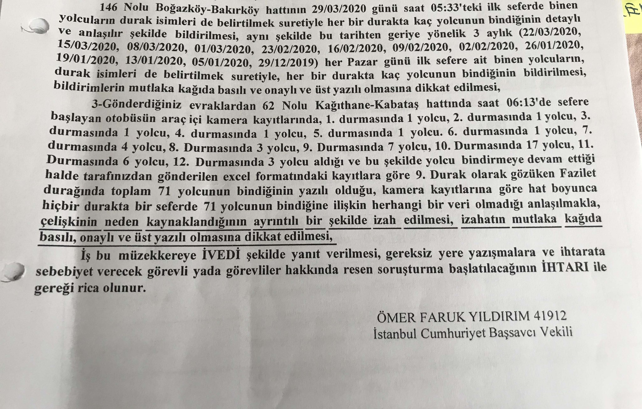 İstanbul Cumhuriyet Başsavcılığı; İstanbul Büyükşehir Belediyesi Hukuk Müşavirliği'nin gönderdiği evrakta, 29 Mart 2020 Pazar günü 62 No'lu Kağıthane-Kabataş hattında çalışan ve saat: 06.13'de hareket eden otobüsle ilgili bilgilerin yanlış gönderildiğini saptadı.