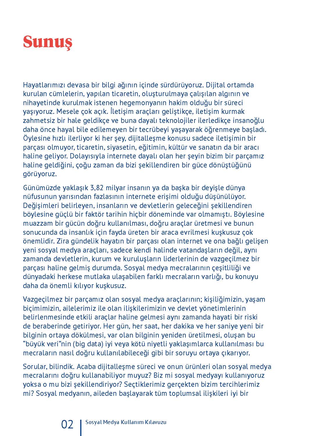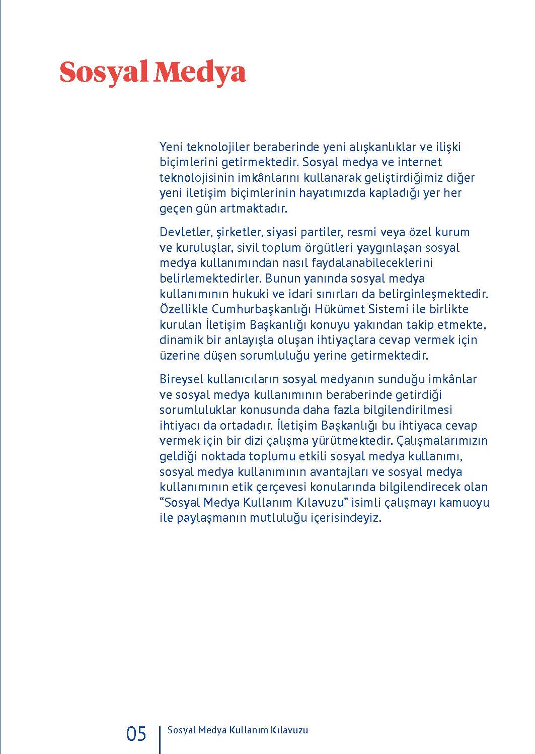 Cumhurbaşkanlığı İletişim Başkanlığı, bireyler ve kurumlar için önemli bir iletişim mecrası haline gelen sosyal medyanın doğru kullanımına yönelik bir rehber olması amacıyla "Sosyal Medya Kullanım Kılavuzu" kitabı hazırladı. "Sosyal Medya Kullanım Kılavuzu" kitabında, dijital iletişimin en önemli kanallarından biri olan sosyal medya tüm boyutlarıyla ele alınıyor.