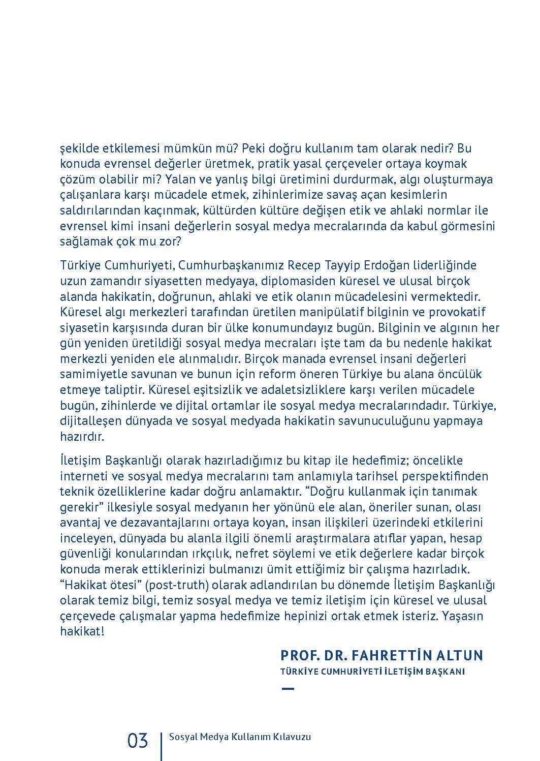 Cumhurbaşkanlığı İletişim Başkanlığı, bireyler ve kurumlar için önemli bir iletişim mecrası haline gelen sosyal medyanın doğru kullanımına yönelik bir rehber olması amacıyla "Sosyal Medya Kullanım Kılavuzu" kitabı hazırladı. İletişim Başkanı Fahrettin Altun, kitabın önsözünde, "Hakikat ötesi (posttruth) olarak adlandırılan bu dönemde İletişim Başkanlığı olarak temiz bilgi, temiz sosyal medya ve temiz iletişim için küresel ve ulusal çerçevede çalışmalar yapma hedefimize hepinizi ortak etmek isteriz. Yaşasın hakikat!" ifadelerini kullandı.