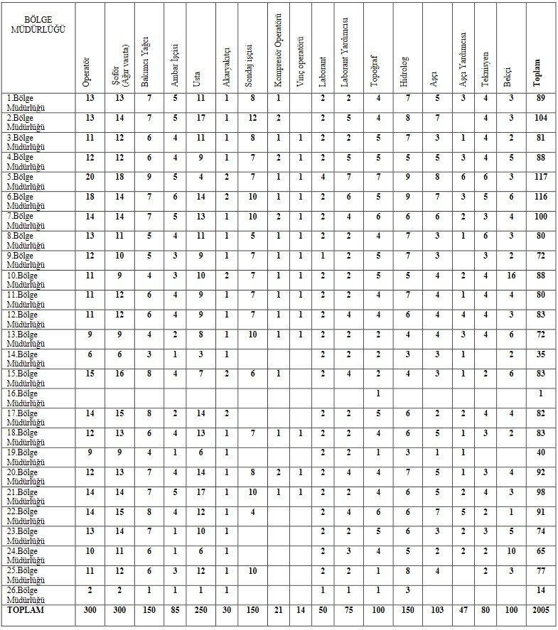 Operatör, Şoför, (Ağır vasıta), Bakımcı Yağcı, Ambar İşçisi, Usta, Akaryakıtçı, Sondaj işçisi, Kompresör Operatörü, Vinç operatörü, Laborant, Laborant Yardımcısı, Topoğraf, Hidrolog, Aşçı, Aşçı Yardımcısı, Teknisyen, Bekçi.