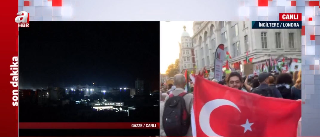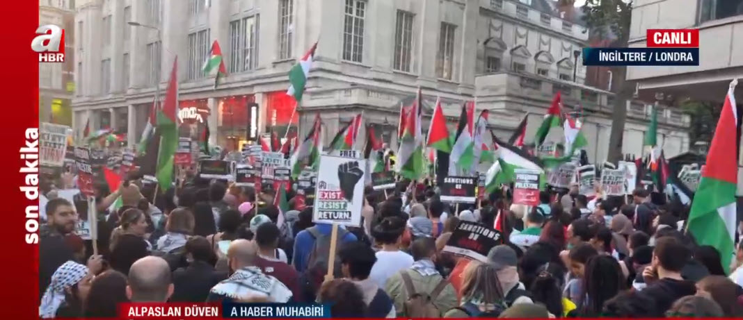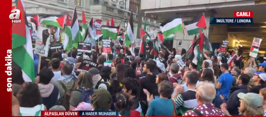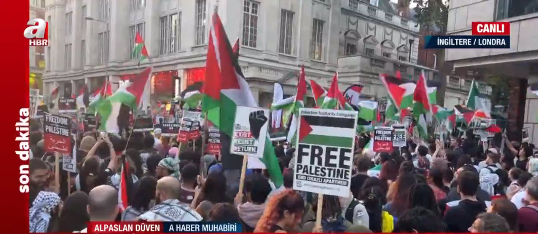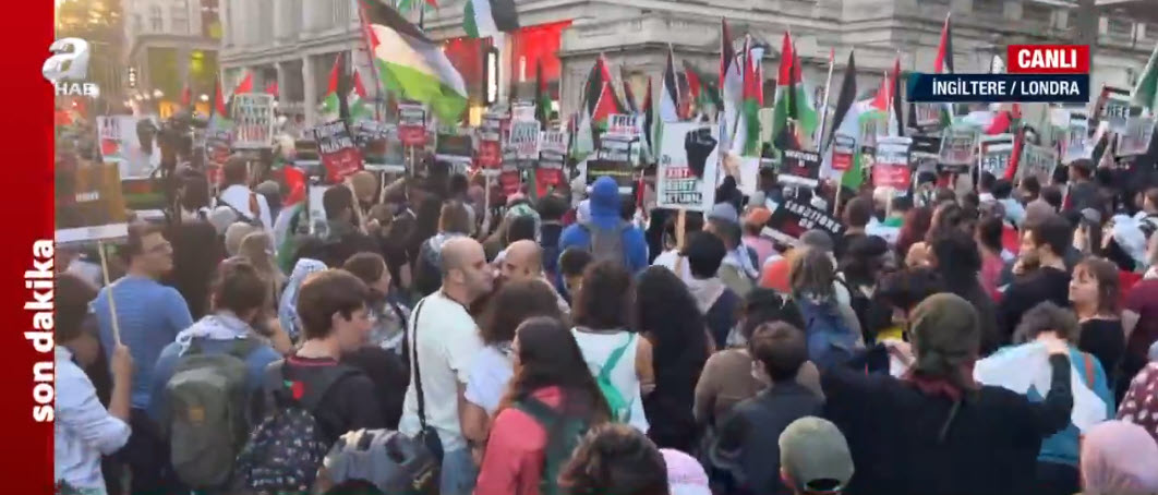 İşgalci İsrail'in Filistin topraklarına yönelik bombalı saldırıları devam ederken tüm dünyada protesto gösterileri düzenleniyor. Londra'daki protesto gösterileri yerel saatle 18.00'da başlamıştı.