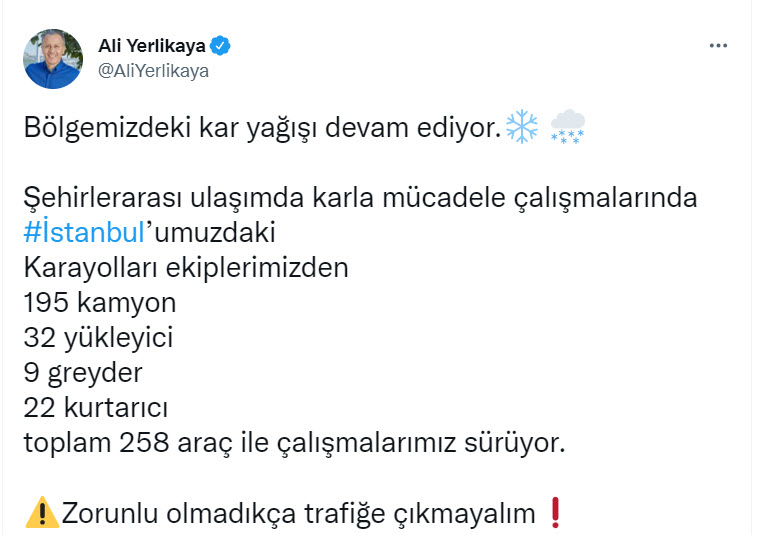 İstanbul'da kar yağışı etkisini sürdürürken bazı ilçelerde ulaşımda aksamalar yaşanıyor. Kentin bazı ilçelerinde kar birikmesi nedeniyle ara sokaklara araç giriş ve çıkışı yapılamıyor. TEM Otoyolu, D-100 kara yolu ve ana arterlerde kara ulaşımı sorunsuz sağlanırken bazı deniz seferleri iptal edildi. Öte yandan İstanbul Valisi Ali Yerlikaya, "Zorunlu olmadıkça trafiğe çıkmayalım" uyarısında bulundu.