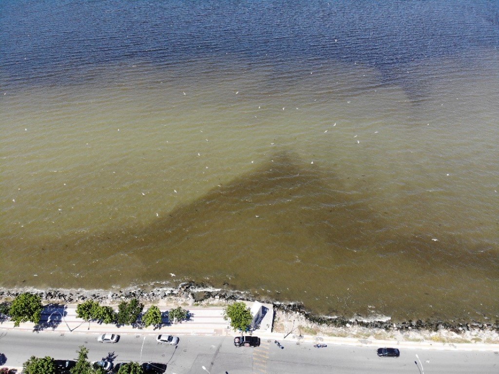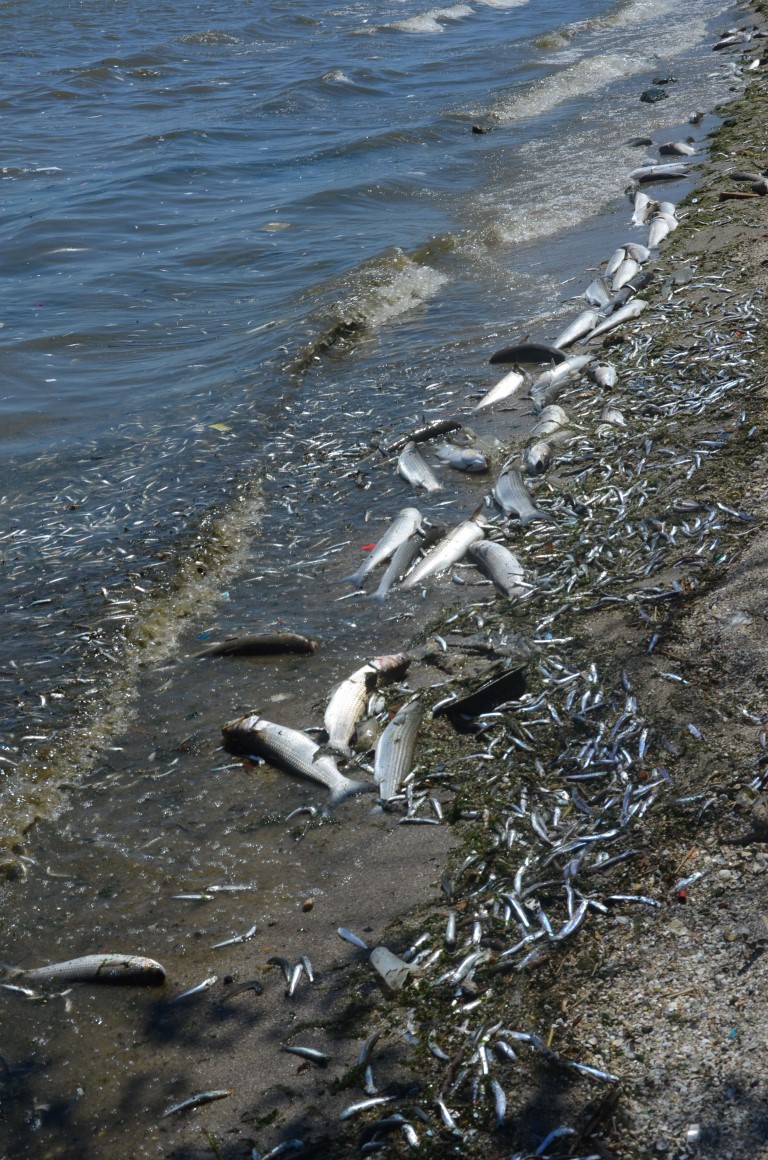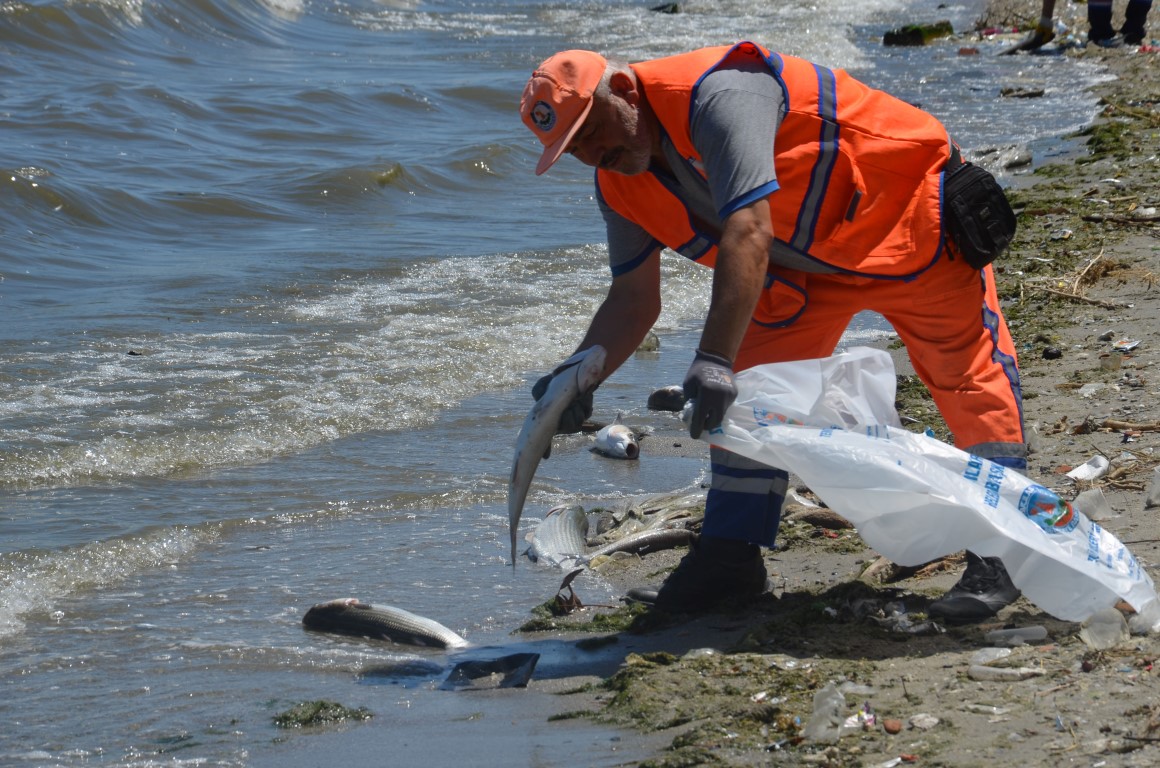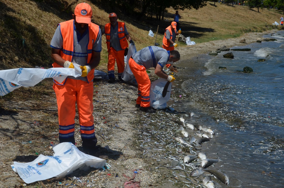 Küçükçekmece Gölü'nde atık suların arıtmadan denize bırakılması neticesinde kıyıya vuran milyonlarca ölü balık vatandaşlar ve işçiler tarafından toplanıyor. Vatandaşlar ve temizlik görevlileri file ile ölü balıkları toplayarak Mimar Sinan Köprüsü üzerinde açılan çöp poşetlerine dolduruyor.