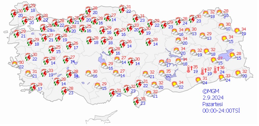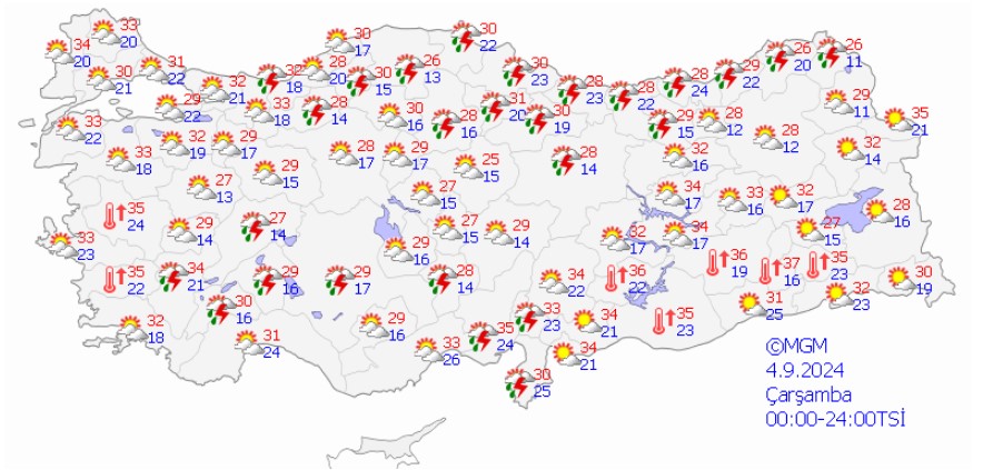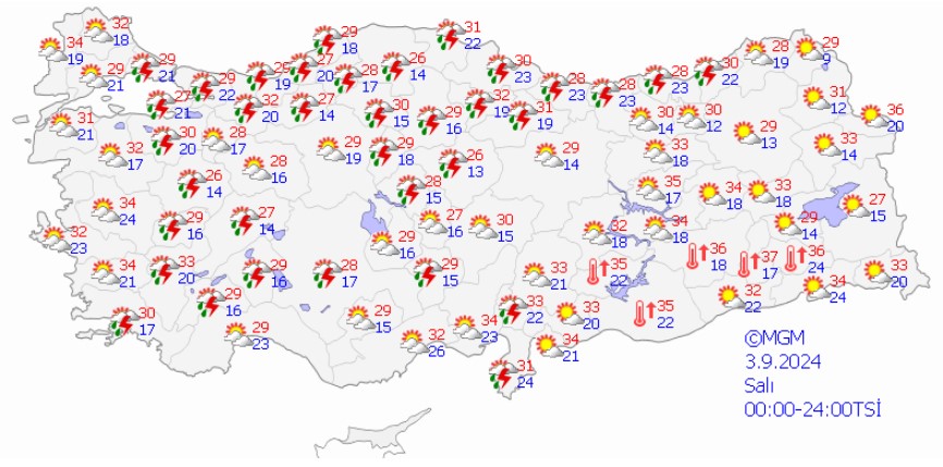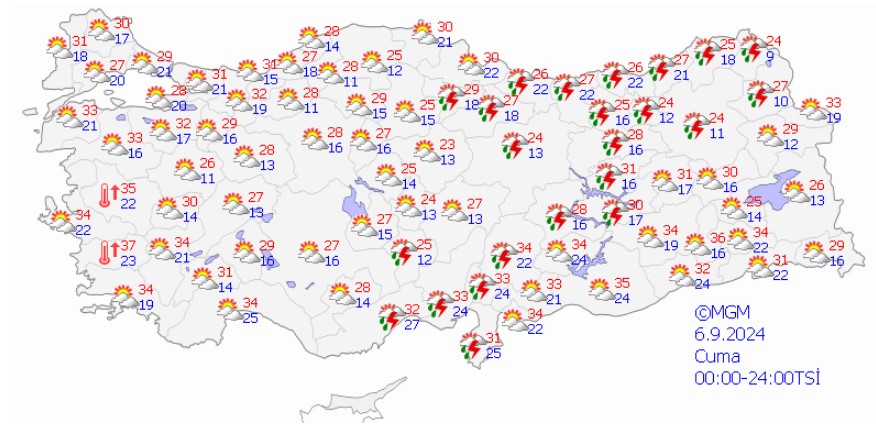 Meteoroloji Genel Müdürlüğü tarafından yapılan son tahminlere göre: Ülkemizin kuzey, iç ve batı kesimlerinin parçalı yer yer çok bulutlu, Marmara, İç Ege, Akdeniz, İç Anadolu'nun kuzeyi, Batı ve Orta Karadeniz ile Doğu Karadeniz kıyılarının yerel sağanak ve gök gürültülü sağanak yağışlı, diğer yerlerin az bulutlu ve açık geçeceği tahmin ediliyor.