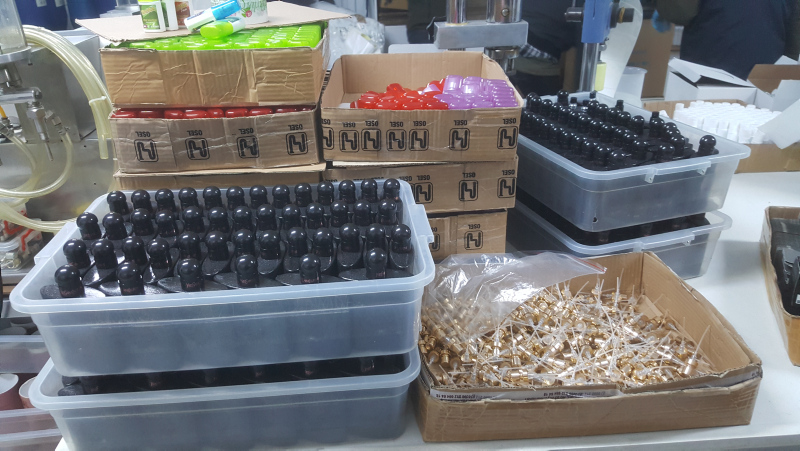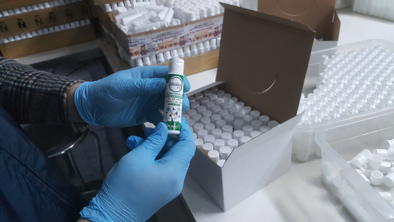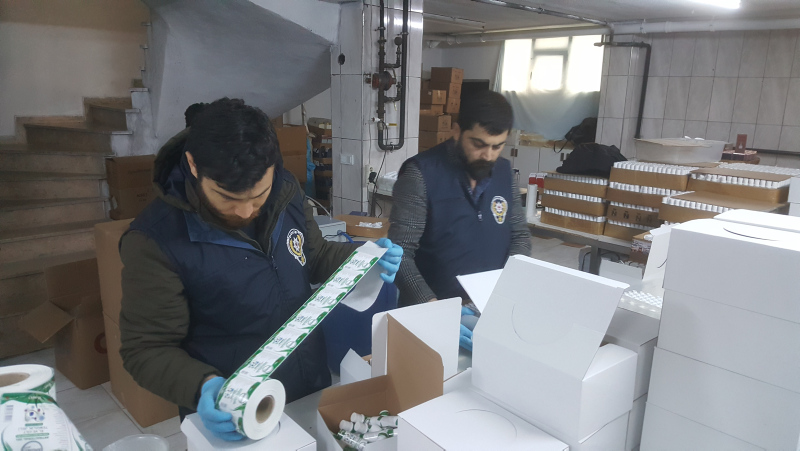 Operasyonda 15 bin adet sahte dezenfektan ürünü, çok sayıda boş şişe, bidonlar içinde ham madde, dolum cihazları, kapak ve etiketler ele geçirildi.