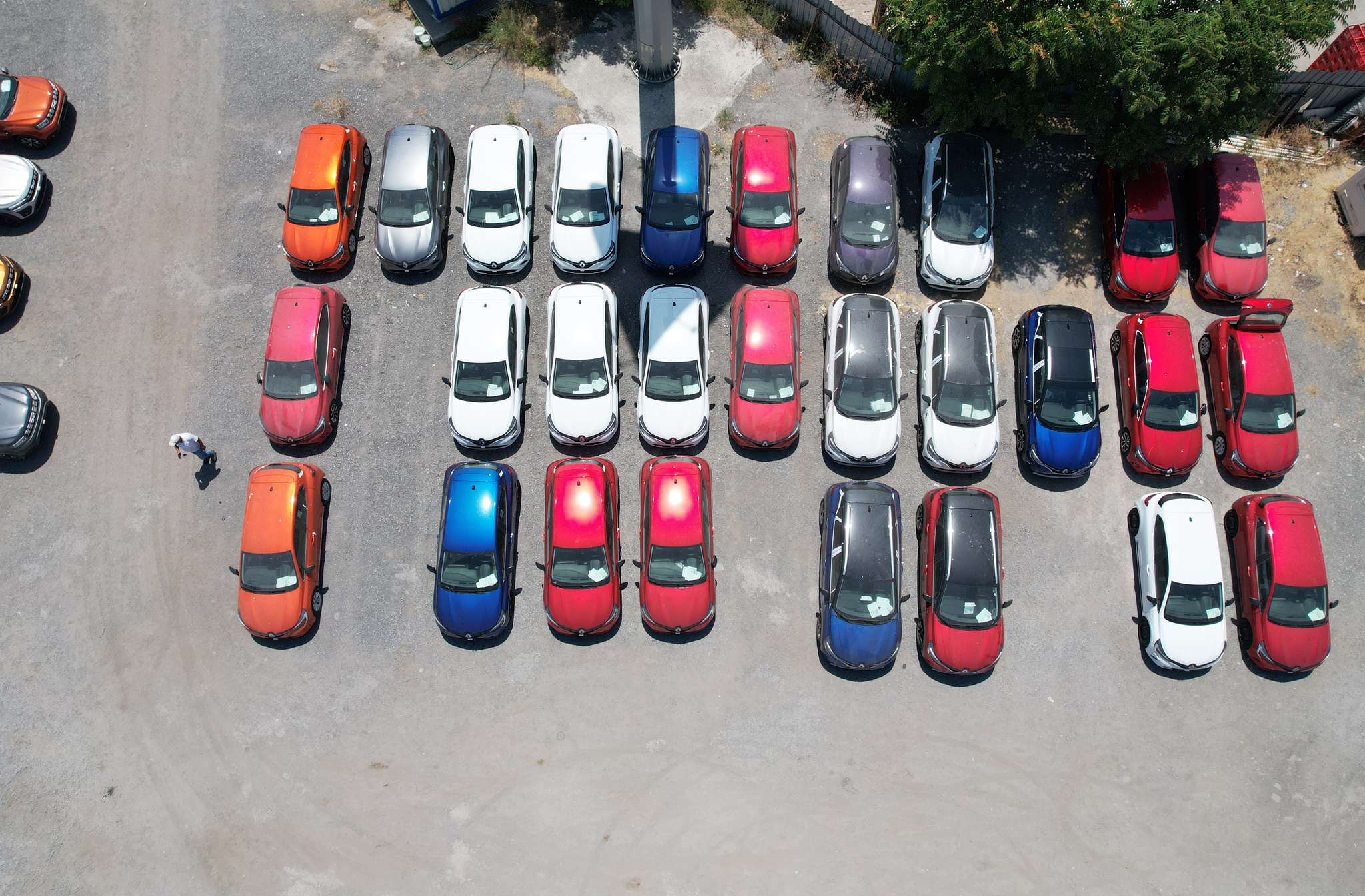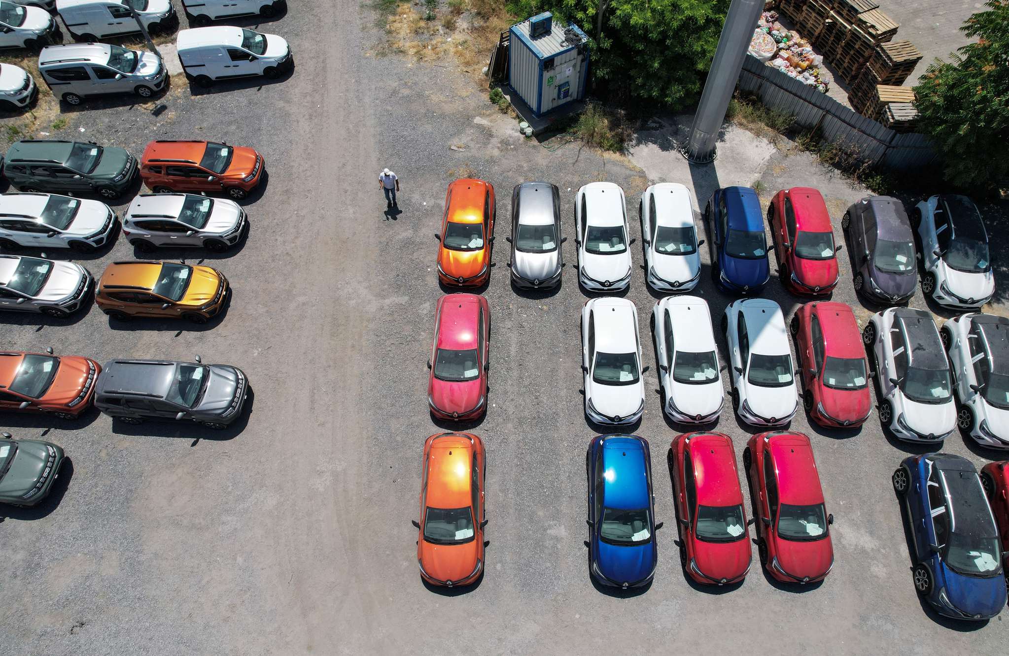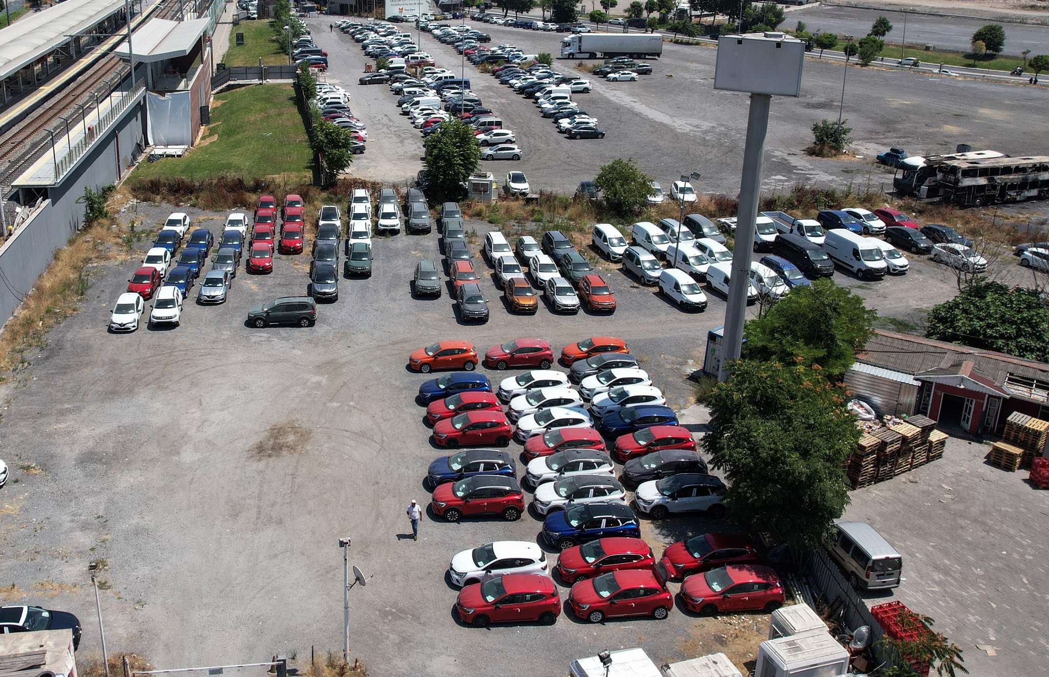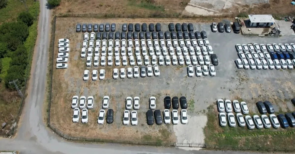 İstanbul Havalimanı'na yaklaşık 5 kilometre uzaklıkta otoyol kenarında çevrilen alana stoklanan otomobiller, dron kamerasına yansıdı. Görüntülerde aynı renk ve modellerden oluşan onlarca aracın yan yana dizildiği ve otoyol ile ormanlık alanın arasında bulunan etrafı çevrili çayırlık alanda stoklandığı görüldü.