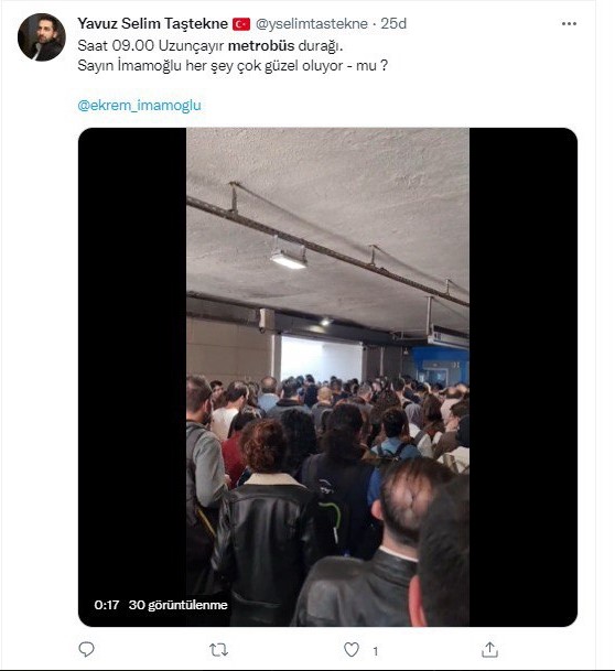 CHP'li İstanbul Büyükşehir Belediye (İBB) Başkanı Ekrem İmamoğlu'nun koltuğa oturduğu günden bugüne ulaşımdaki arızalar İstanbulluların hayatını çileye çevirdi. Bugün de Sefaköy'deki metrobüsün arıza yapması ardından da metrobüs duraklarında insan yığınları oluştu. Adım atılacak yer kalmayan üst geçitleri paylaşan vatandaşlar "Umrunuzda değil ama çöker, haberiniz olsun" ifadelerini kullandı. İstanbullunun ulaşım mağduriyeti her geçen gün artıyor. Metrobüslerdeki bitmeyen sıralara, izdihama tepki gösteren vatandaşlar, bu anları gözler önüne seren fotoğrafları ve videoları sosyal medya hesaplarından paylaşarak İBB'ye isyan etti! İşte o paylaşımlar…
