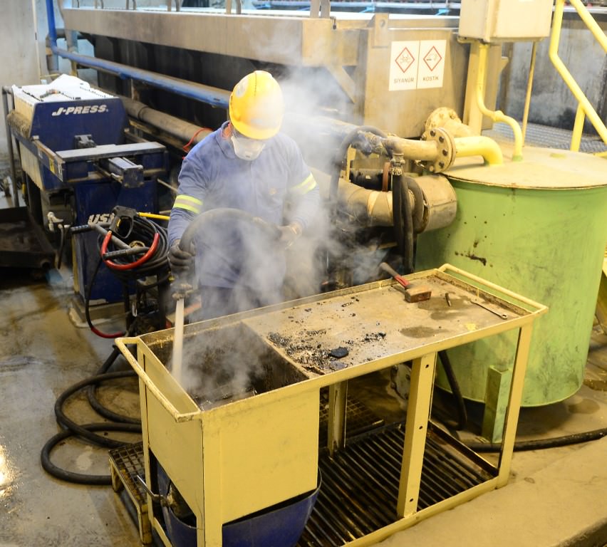 Sıvı çözeltideki altın, tanklar içindeki karbon tanecikleri tarafından tutuluyor, basınç altında aktif karbondan sıyrılan altın elektrolizten geçirilerek katı zerrecikler halinde toplanıyor.