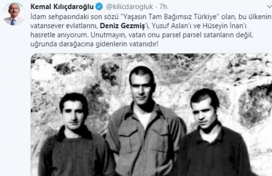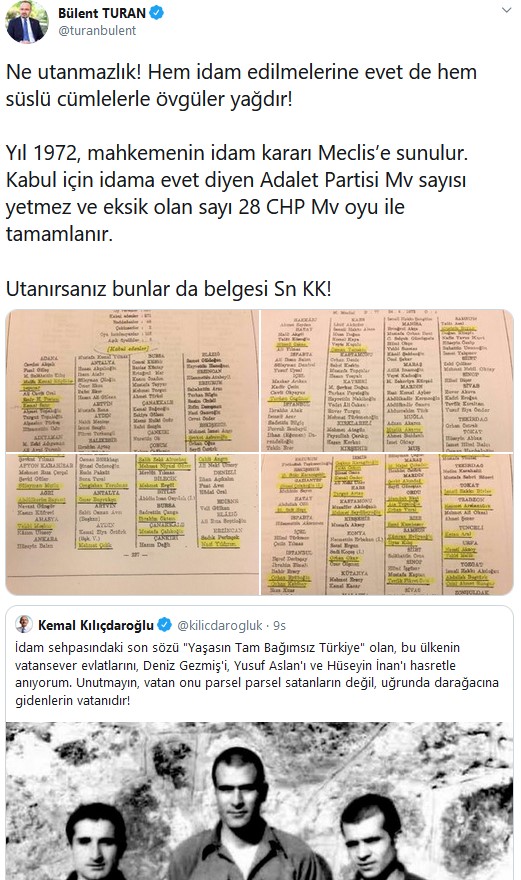 En başta CHP Genel Başkanı Kemal Kılıçdaroğlu, İBB Başkanı Ekrem İmamoğlu ve İl Başkanı Canan Kaftancıoğlu olmak üzere birçok CHP'li, sosyal medyada paylaştıkları "süslü cümlelerle", idam edilen Deniz Gezmiş ve arkadaşlarını andılar. Deniz Gezmiş üzerinden CHP hakkında ise gerçekler bambaşka bir boyutta... Öyle ki 1972 yılında idam edilen Deniz Gezmiş ve arkadaşlarının idamına onay veren vekillerden 30'u, CHP'li isimlerden oluşuyordu! İşte CHP'de Deniz Gezmiş'i ve arkadaşlarının idamına onay veren isimler...