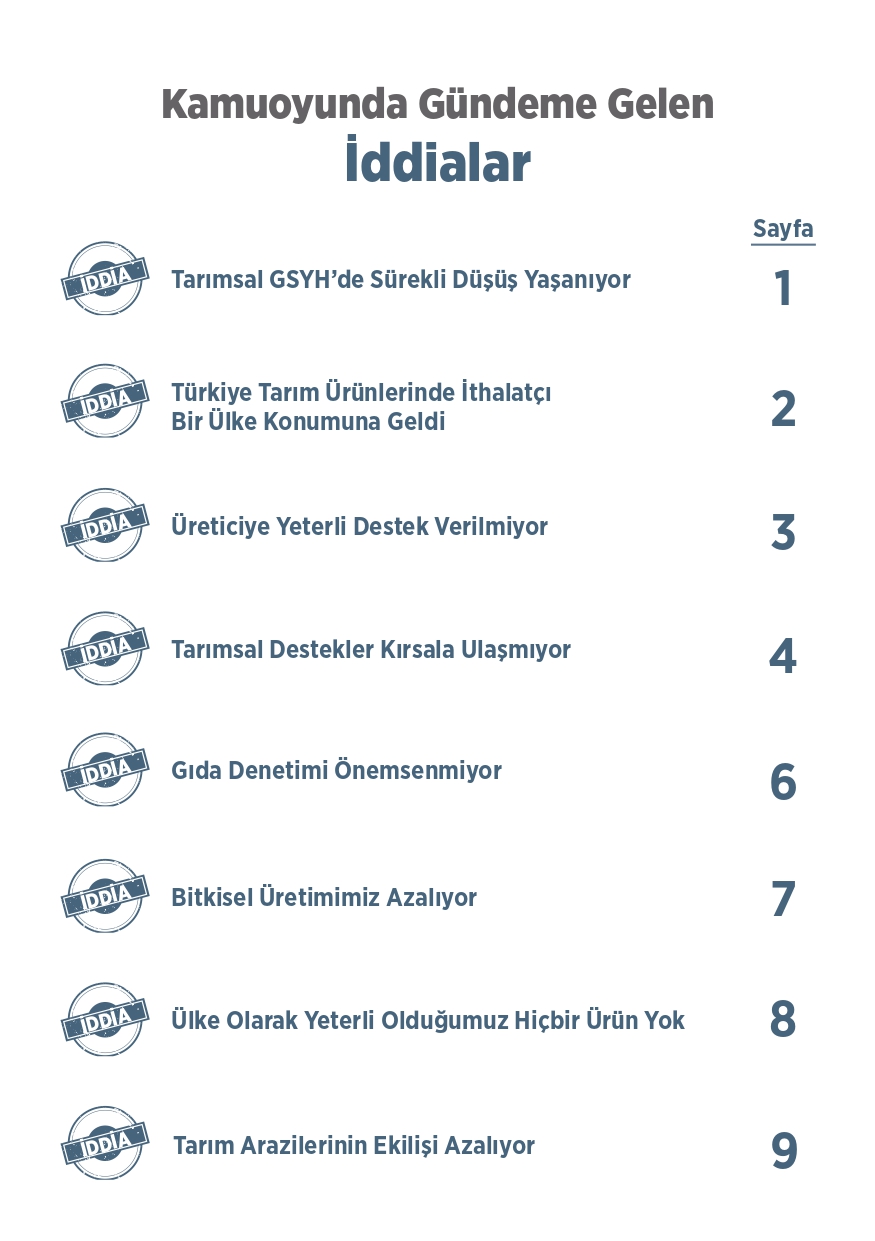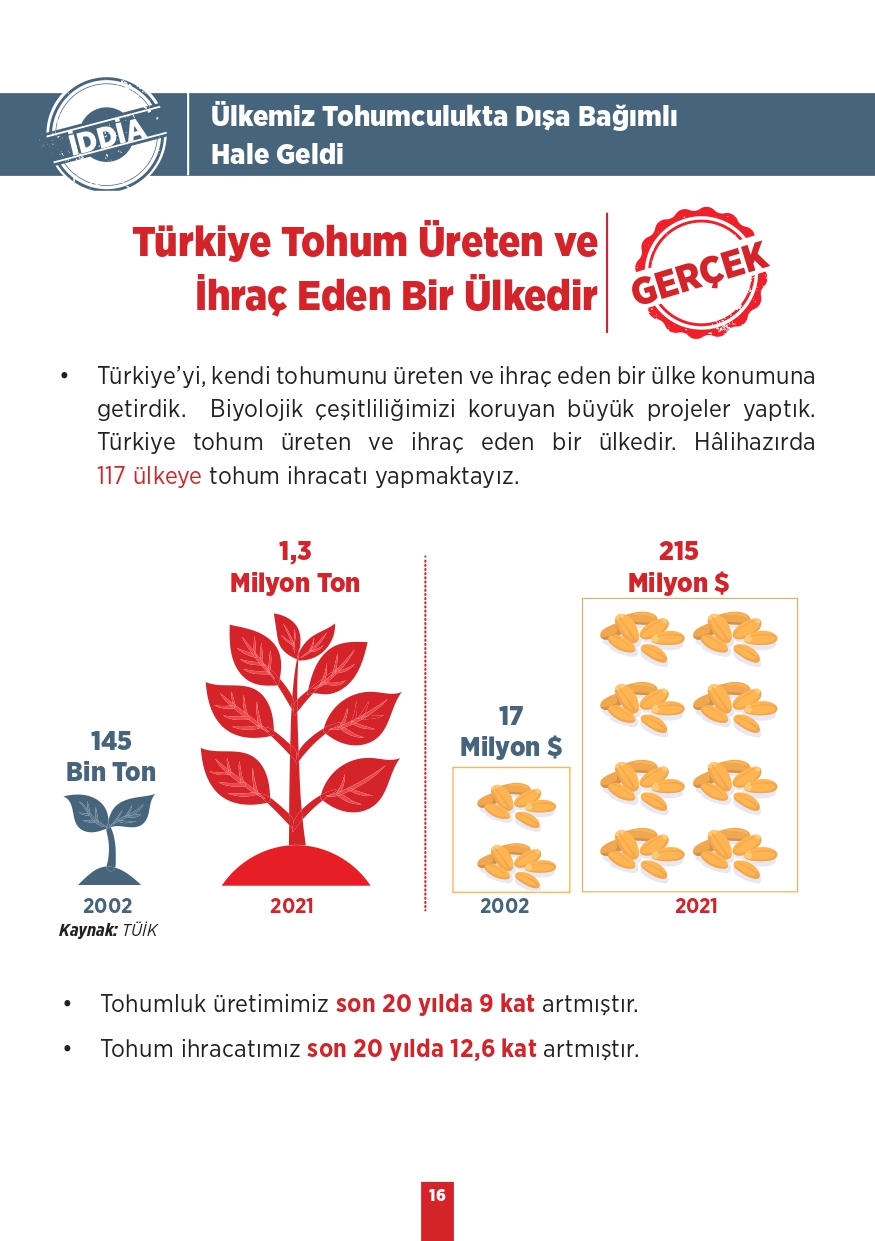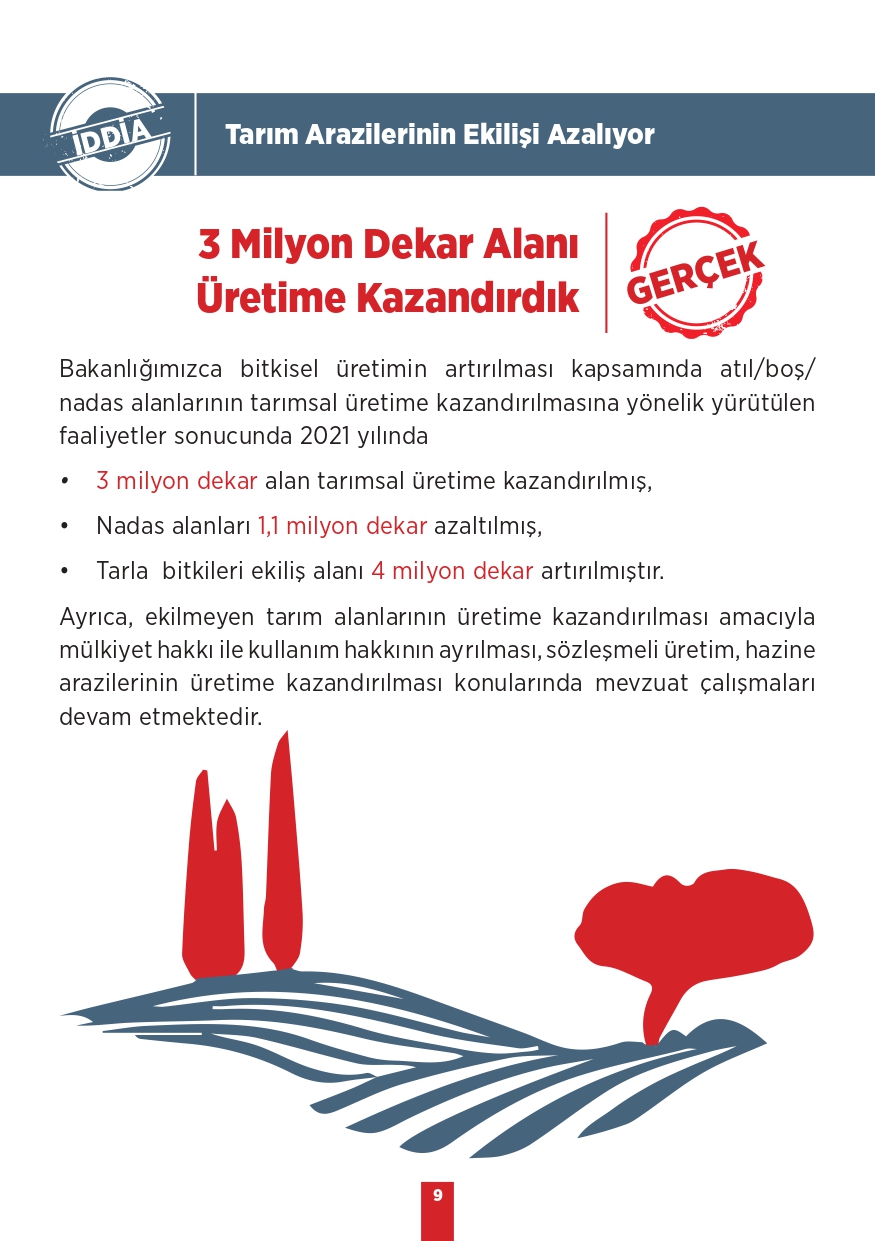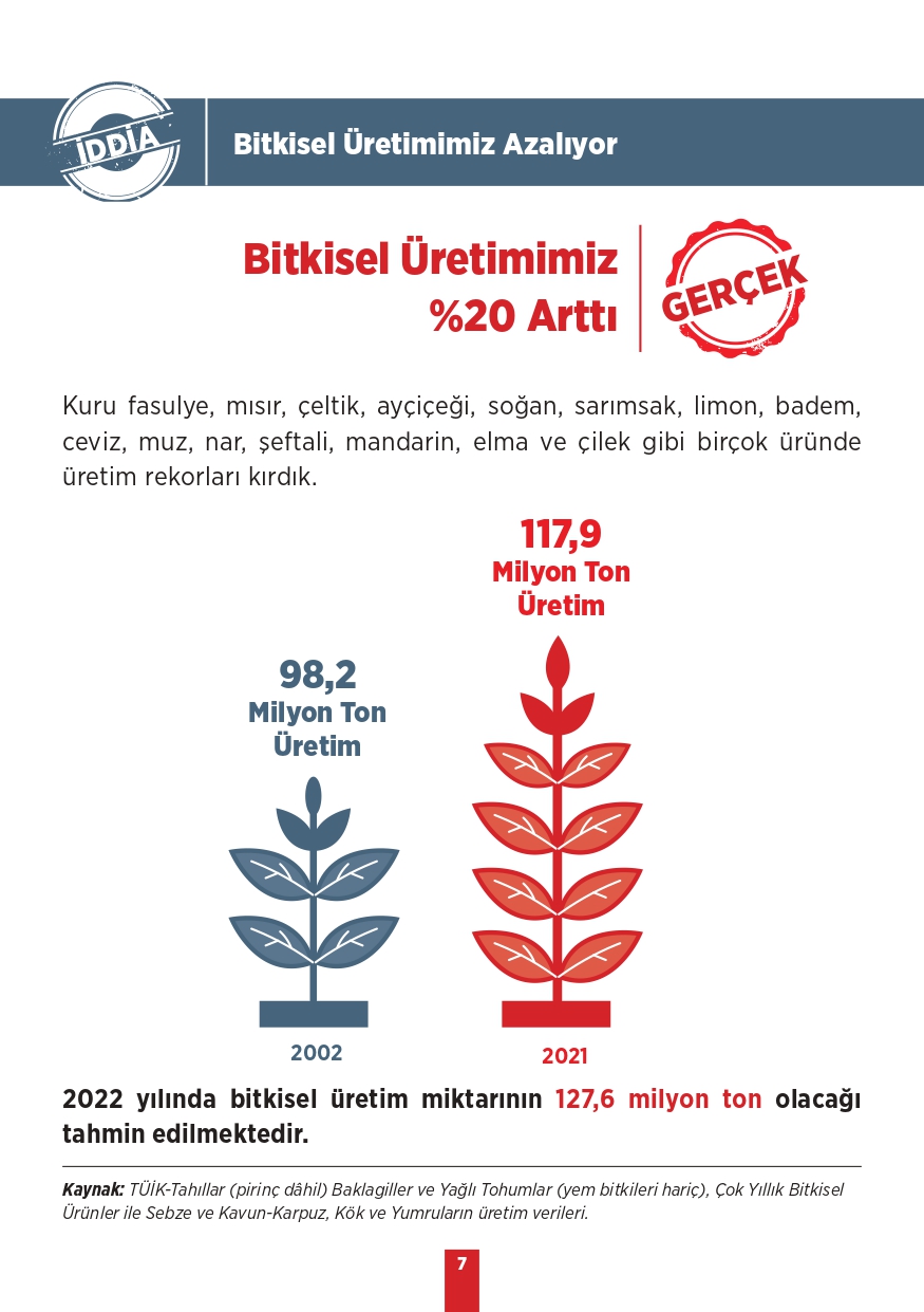 Tarım ve Orman Bakanlığı tarafından paylaşılan "Kamuoyunda gündeme gelen iddialar ve gerçekler" isimli bilgilendirme metninde toplum tarafında doğru bilinen yanlışlara yer verildi. Özellikle muhalif medya tarafından öne çıkarılan bu yalanlar, toplumda yanlış algıya neden olurken Tarım ve Orman Bakanlığı tüm merak edilen konulara açıklık getirdi. "Bitkisel üretimimiz azalıyor, Tohumlulukta dışa bağımlı hale geldik, Orman yangınlarına müdahale edilmiyor, Yeterli fidan dikilmiyor" gibi vatandaşlar arasında doğru bilinen yanlışları Tarım ve Orman Bakanlığı rakamsal verilere dayandırarak paylaştı. İşte yalanlar ve gerçekler...