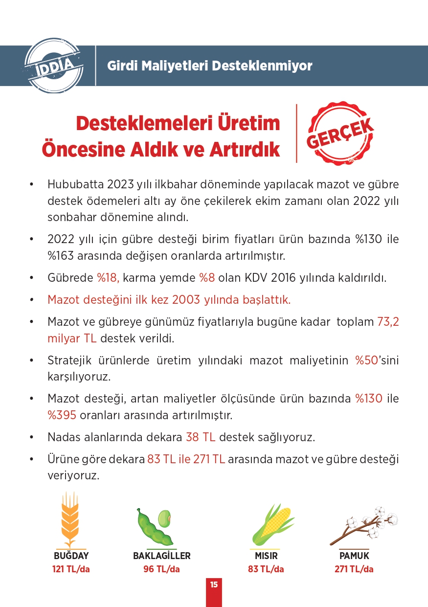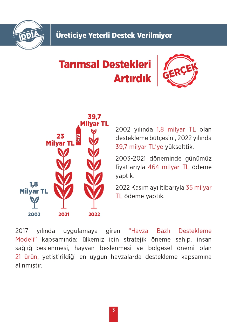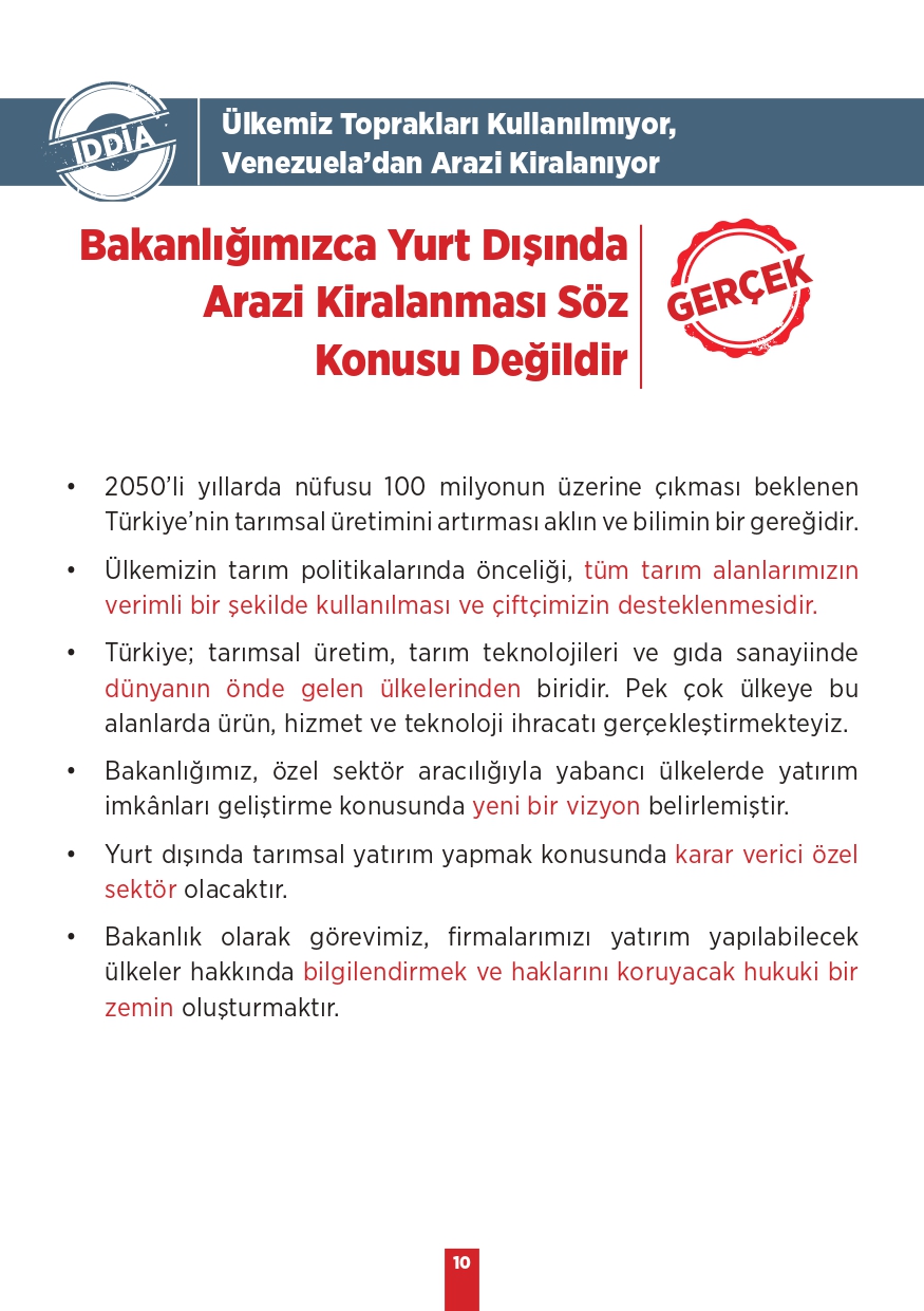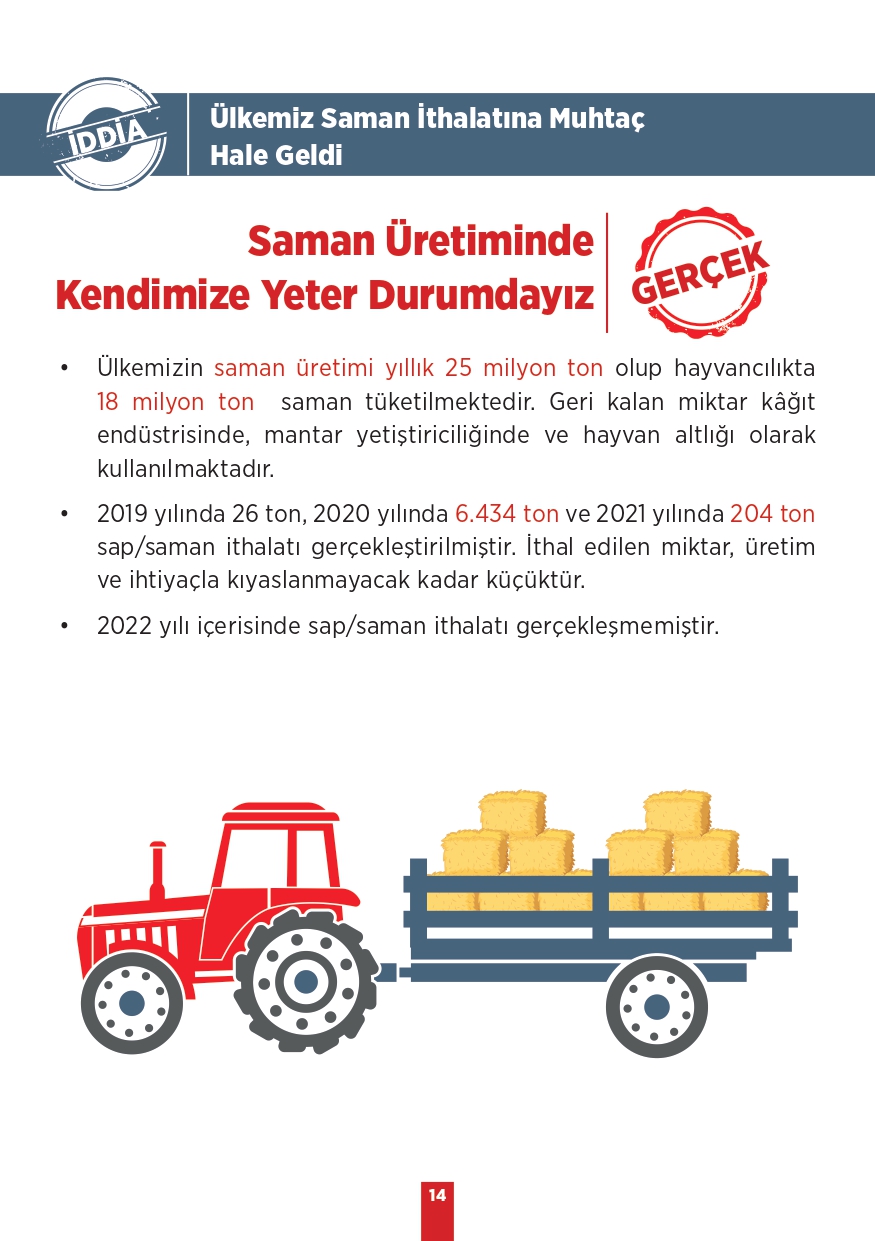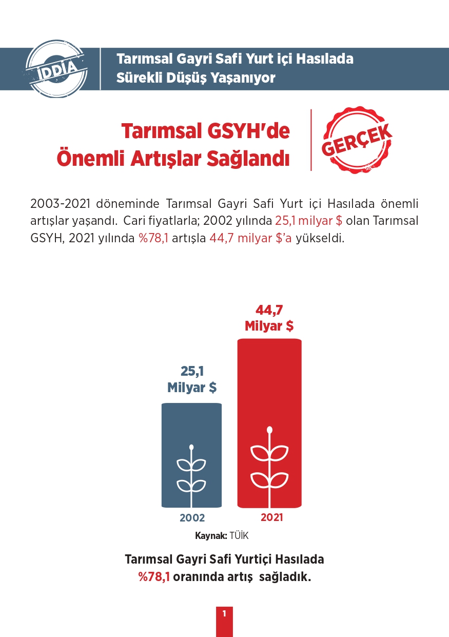 Tarım ve Orman Bakanlığı tarafından paylaşılan "Kamuoyunda gündeme gelen iddialar ve gerçekler" isimli bilgilendirme metninde toplum tarafında doğru bilinen yanlışlara yer verildi. Özellikle muhalif medya tarafından öne çıkarılan bu yalanlar, toplumda yanlış algıya neden olurken Tarım ve Orman Bakanlığı tüm merak edilen konulara açıklık getirdi. "Bitkisel üretimimiz azalıyor, Tohumlulukta dışa bağımlı hale geldik, Orman yangınlarına müdahale edilmiyor, Yeterli fidan dikilmiyor" gibi vatandaşlar arasında doğru bilinen yanlışları Tarım ve Orman Bakanlığı rakamsal verilere dayandırarak paylaştı. İşte yalanlar ve gerçekler...