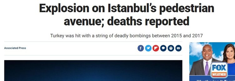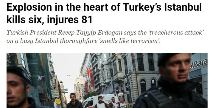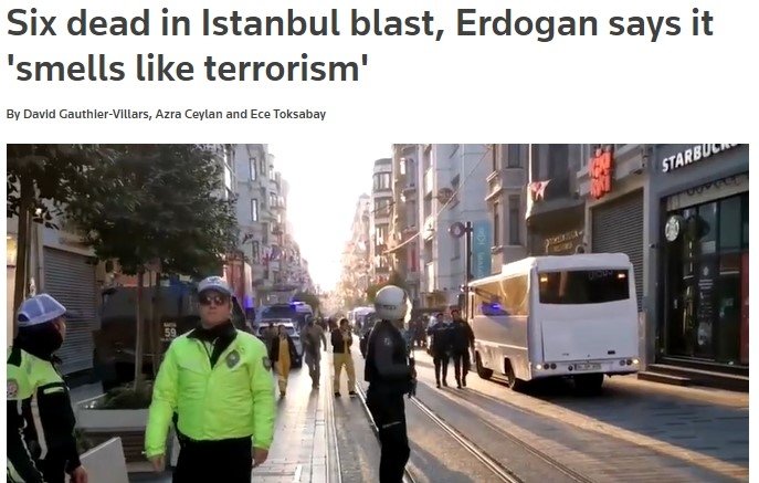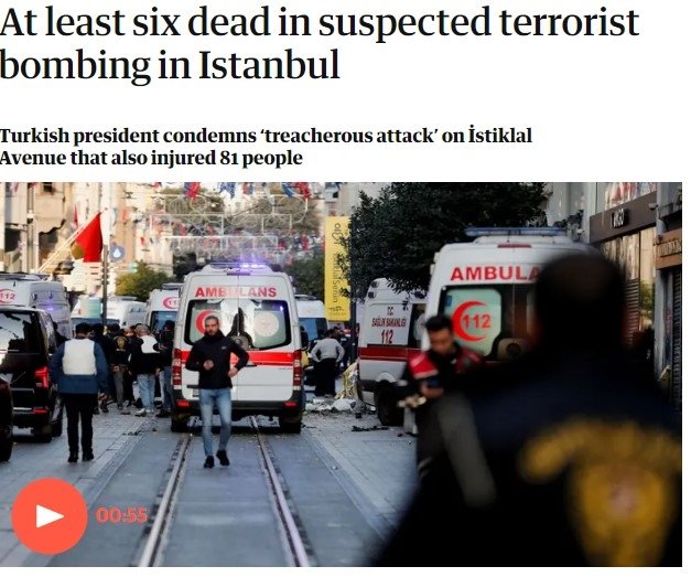 İngiliz gazetesi The Guardian ise İstanbul'da terör saldırısı şüphesiyle en az 6 kişinin öldüğünü, 81 kişinin ise yaralandığını söyledi. Aynı zamanda Başkan Erdoğan'ın hain saldırının sorumlularının cezalandırılacağını söylediğinden de bahsedildi.