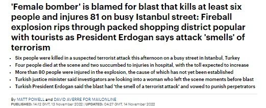 İstiklal Caddesi'nde yaşanan alçak saldırının ardından dünyanın gözü Türkiye'ye çevrildi. Pek çok haber ajansı saldırıyı 'acil' koduyla geçerken Başkan Erdoğan'ın "Terör kokusu var" sözlerine atıf yapıldı. İşte dünya kanlı saldırıyı böyle manşetlerine taşıdı.