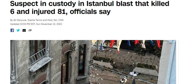 Dün akşam saatlerinde İstanbul İstiklal Caddesi'nde yaşanan bombalı saldırının ardından Türkiye ayağa kalktı. 6 kişinin yaşamını yitirdiği, 81 kişinin ise yaralandığı saldırı ile ilgili açıklama yapan İçişleri Bakanı Süleyman Soylu, bombayı bırakan kişinin yakalandığını ifade etti.