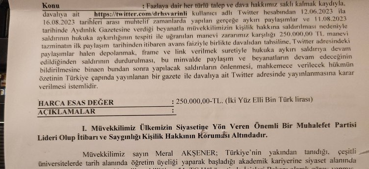 Akşener'in açtığı davayı sosyal medya hesabından duyuran Hasan Sami Özvarinli şu ifadelere yer verdi: "Bu paralar bizim gibi insanlar için büyük paralar lakin mevzu millet olunca, canımızdan çok sevdiğimiz vatanımız olunca aslında değersiz rakamlar.