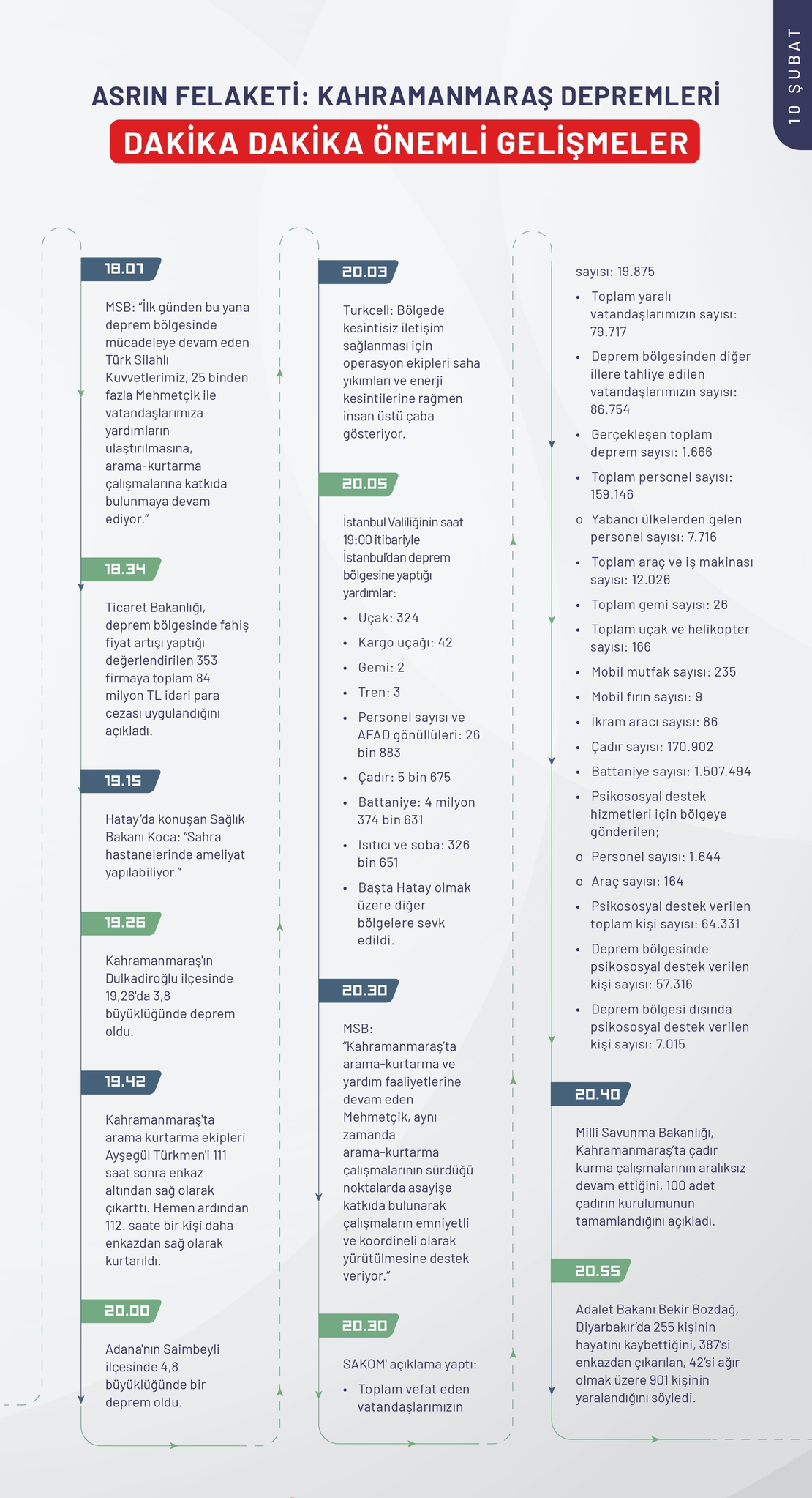 6 Şubat sabahı saat 04.17'de Türkiye'yi yasa boğan Kahramanmaraş depremi meydana geldi. 10 ilde hissedilen depremde on binlerce insan hayatını kaybetti. Dünyanın dört bir yanından depremzedeler için bölgeye yardımlar geldi. İşte Kahramanmaraş, Kilis, Diyarbakır, Adana, Osmaniye, Gaziantep, Şanlıurfa, Adıyaman, Malatya ve Hatay'da büyük yıkıma yol açan depremin ardından geçen 240 saatte yaşananlar.