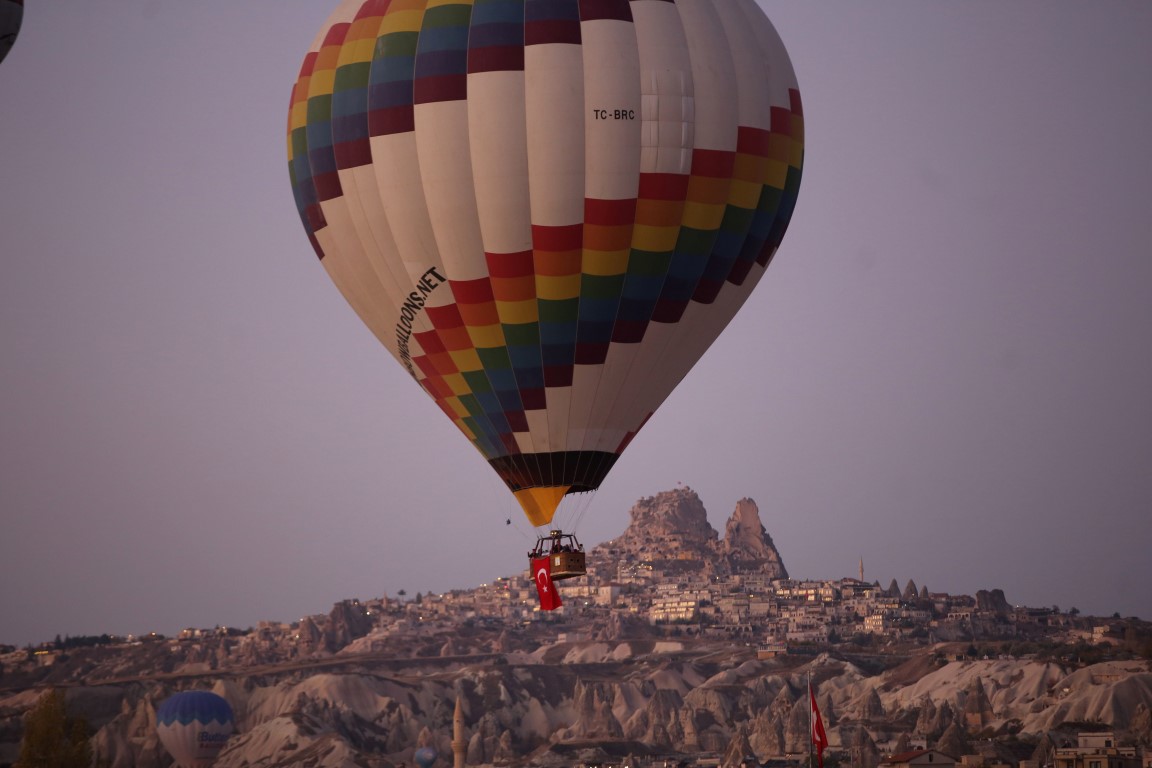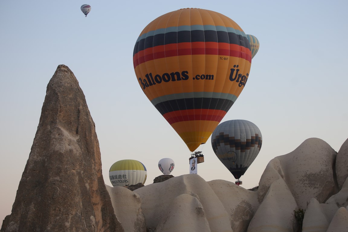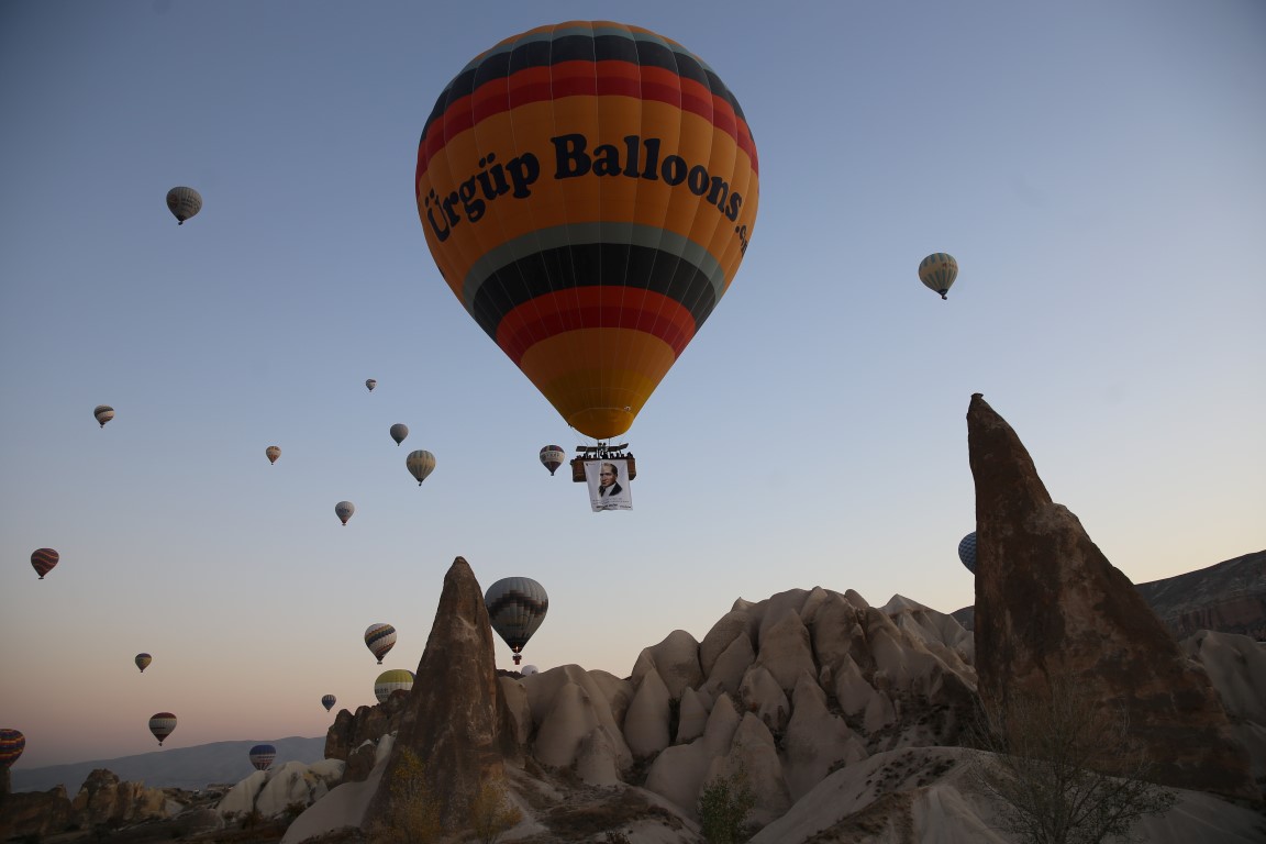 Türkiye Cumhuriyeti'nin kurucusu Gazi Mustafa Kemal Atatürk'ün, ebediyete intikalinin 80. yılı nedeniyle, Kapadokya'da turistlere yönelik tur düzenleyenler sıcak hava balonları sepetlerine Türk bayrağı ve Atatürk'ün resimlerini astı.