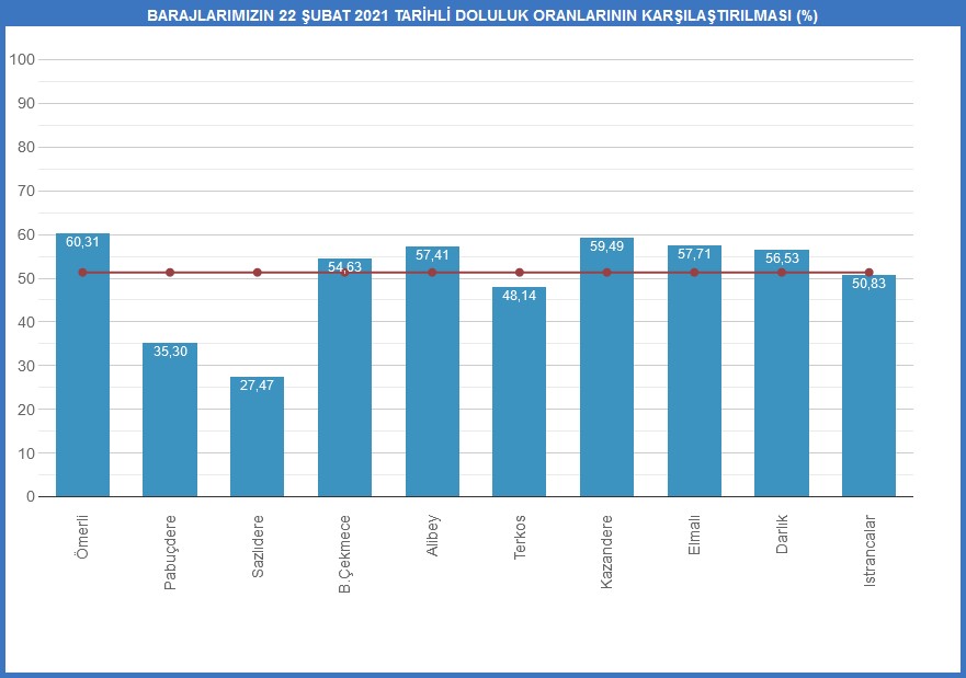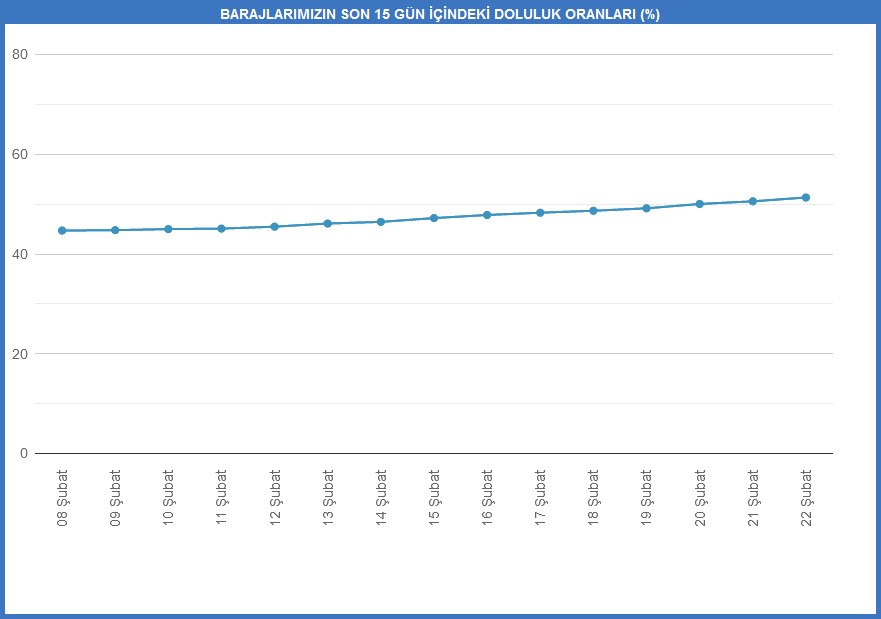 İSKİ'den yapılan açıklamaya göre, 22 Şubat tarihi itibarıyla baraj doluluk oranı yüzde 51,33'e yükseldi. İstanbul'a dün itibarıyla verilen su miktarı ise 2 milyon 943 bin metreküp oldu.