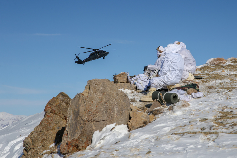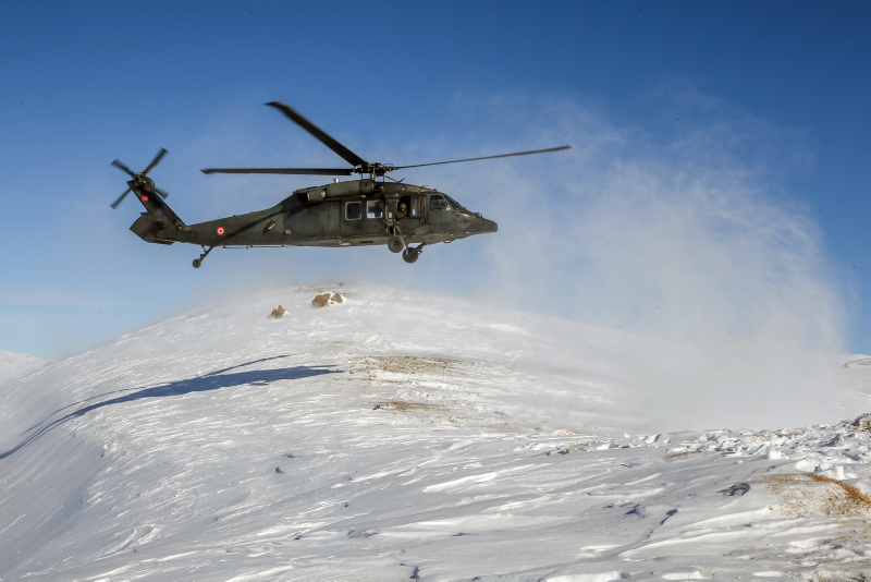 Çetin kış şartlarında hava sıcaklığının sıfırın altında 20 dereceye kadar düştüğü bölgede helikopter ve insansız hava araçlarının da destek verdiği operasyonda, 7 farklı noktada teröristlerce kullanıldığı belirlenen mağara ve barınaklar tespit ediliyor.