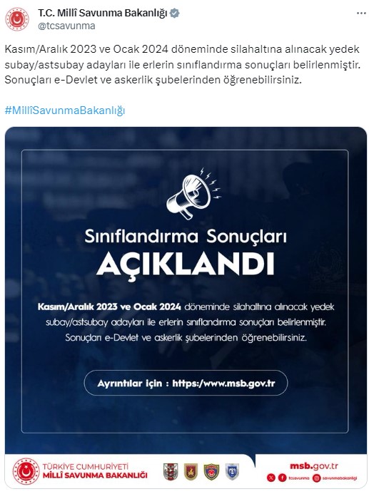 "Askerlik yerleri açıklandı mı son dakika?" sorusu son dakika duyurusunun ardından yanıt buldu. MSB'nin açıklamasına göre, 2023 Kasım celbi askerlik sınıflandırma sonuçları e-Devlet üzerinden sorgulanabiliyor. İşte, 2023 Kasım celbi askerlik yerleri öğrenme ekranı e-Devlet!