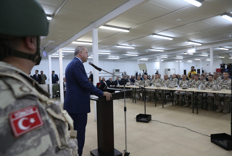Erdoğan, sınır içinde ve dışında Türkiye'nin bekası, milletin güvenliği, dost ve kardeş ülkelerin huzuru için fedakarca görev yapan tüm emniyet güçlerine Allah'tan başarı dileyerek, "Sizlere tüm Türkiye'nin selamlarını, sevgilerini getirdim. 82 milyonun her bir ferdinin duası daima sizinledir. Sizler burada 2 bin 200 senelik mazisiyle dünyanın en köklü ordularından olan Türk Silahlı Kuvvetlerinin şerefli birer mensubu olarak görev yapıyorsunuz. Her biriniz aynı zamanda Türk milletinin temsilcileri olarak bu topraklarda bulunuyorsunuz. Türkiye Cumhurbaşkanı ve Başkomutan olarak her birinizi tek tek gözlerinizden öpüyorum." diye konuştu.