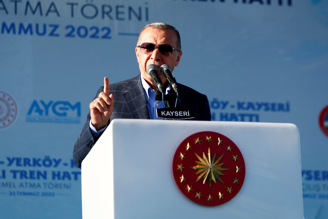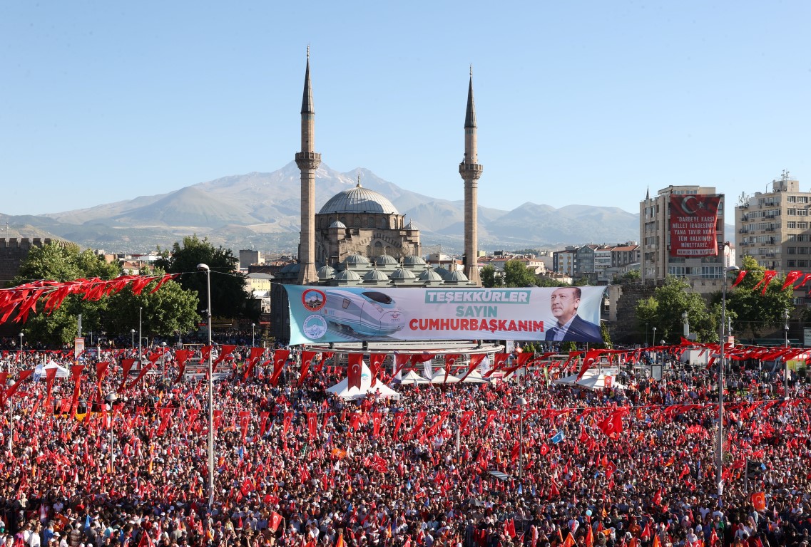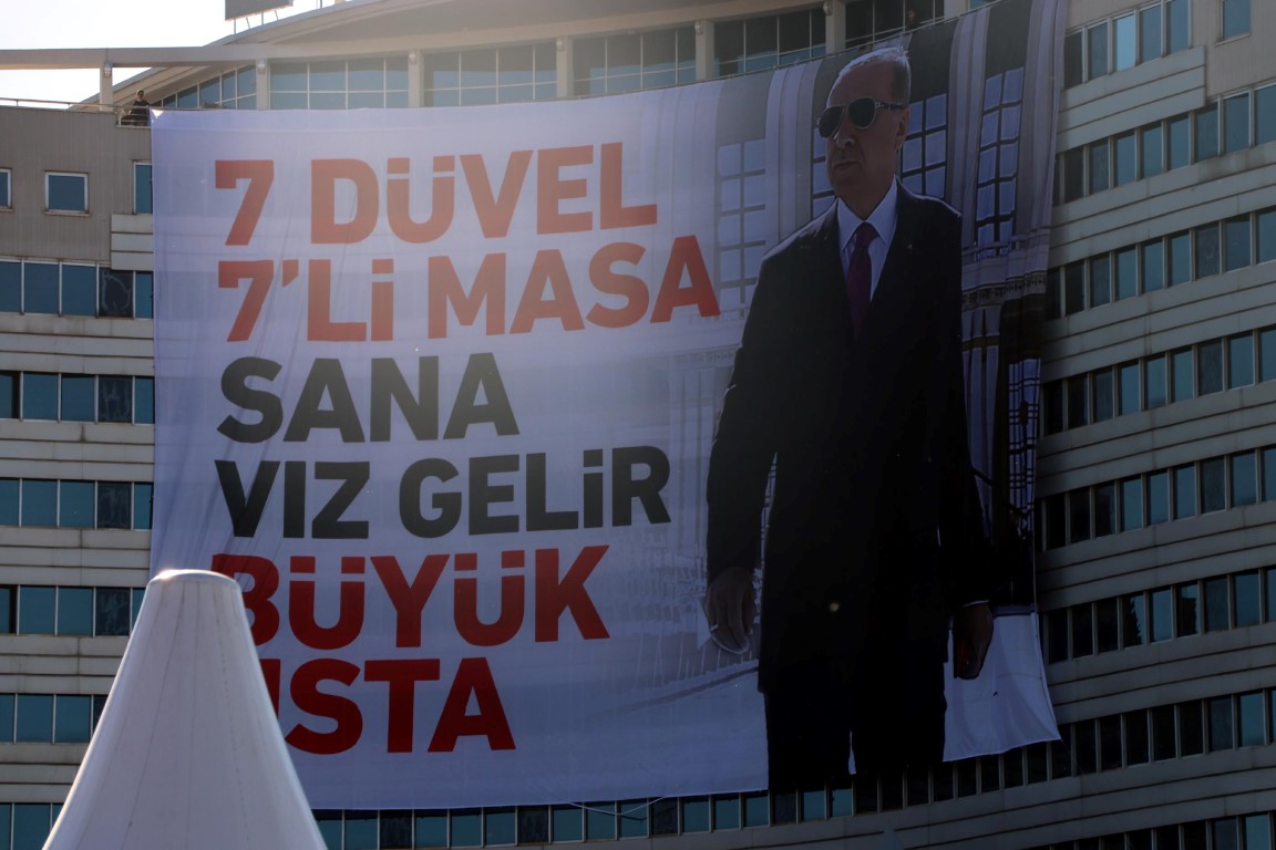Toplu açılış töreni için Kayseri'de bulunan Başkan Recep Tayyip Erdoğan'ın konuşacağı Cumhuriyet Meydanı'na '7 düvel 7'li masa sana vız gelir büyük usta' yazılı dev bir pankart asıldı.