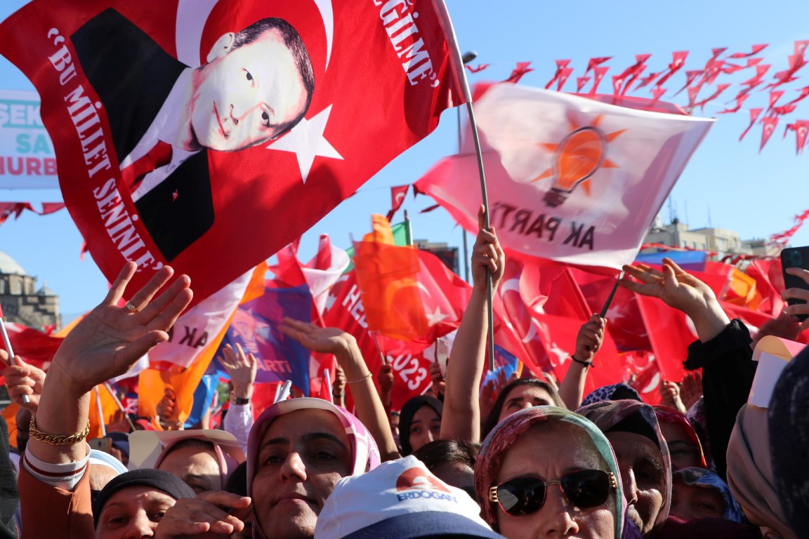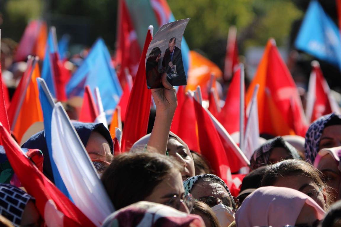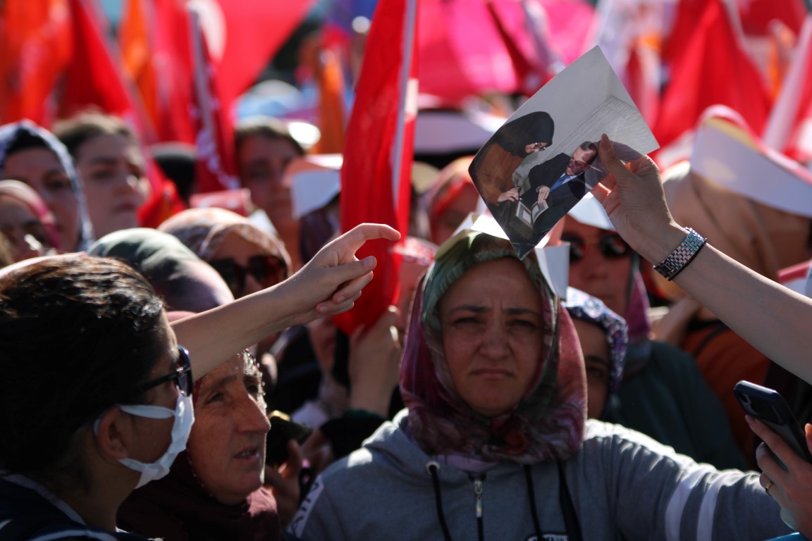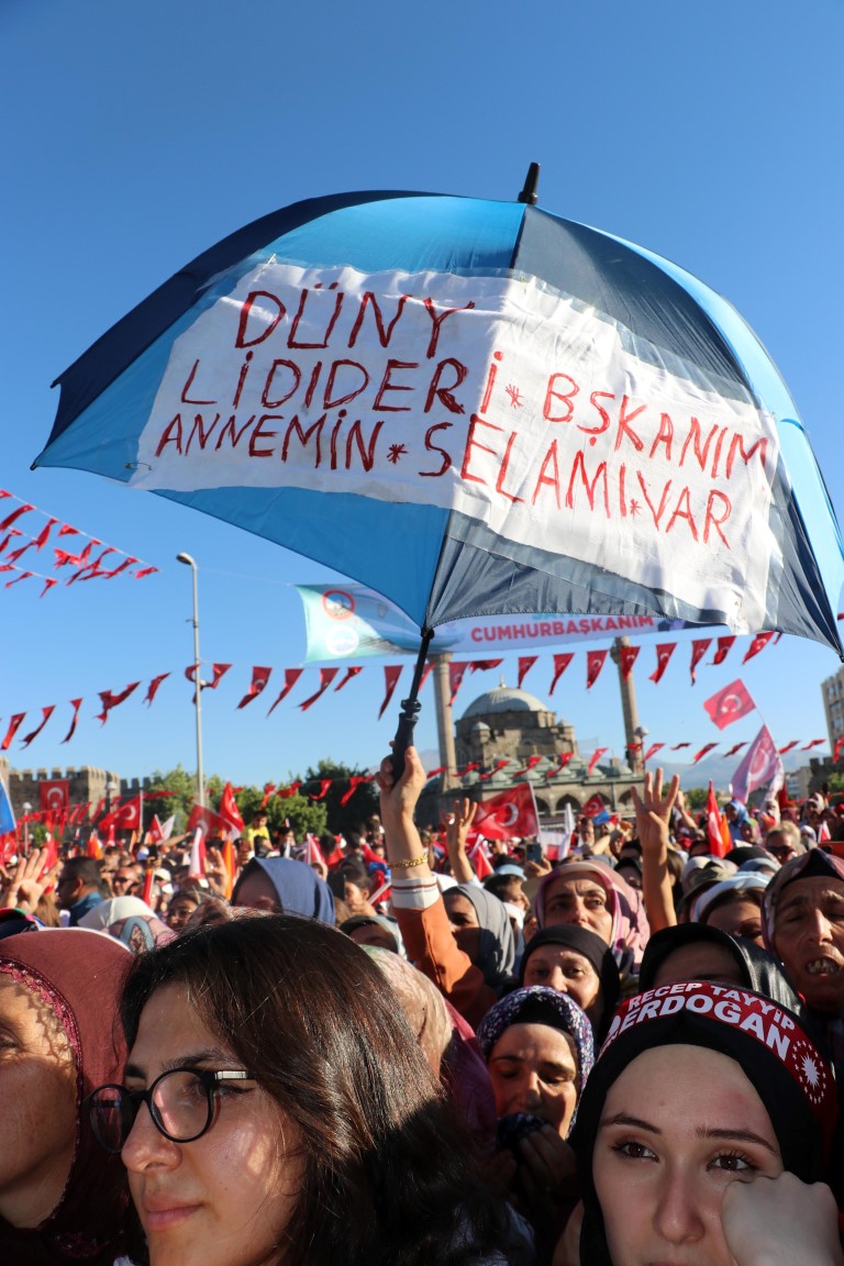 Başkan Erdoğan, bağlantı sırasında alandaki bir binada yer alan pankarta dikkati çekerek, "Buraya enteresan bir şey yazmışlar. '7 düvel, 7'li masa, sana vız gelir büyük usta' demişler. Hayırlı olsun büyük usta. Bu büyük ustanın yanında sizler gibi ana kademe, sizler gibi kadın kolları, sizler gibi gençler olursa, evelallah durmak yok yola devam." dedi.