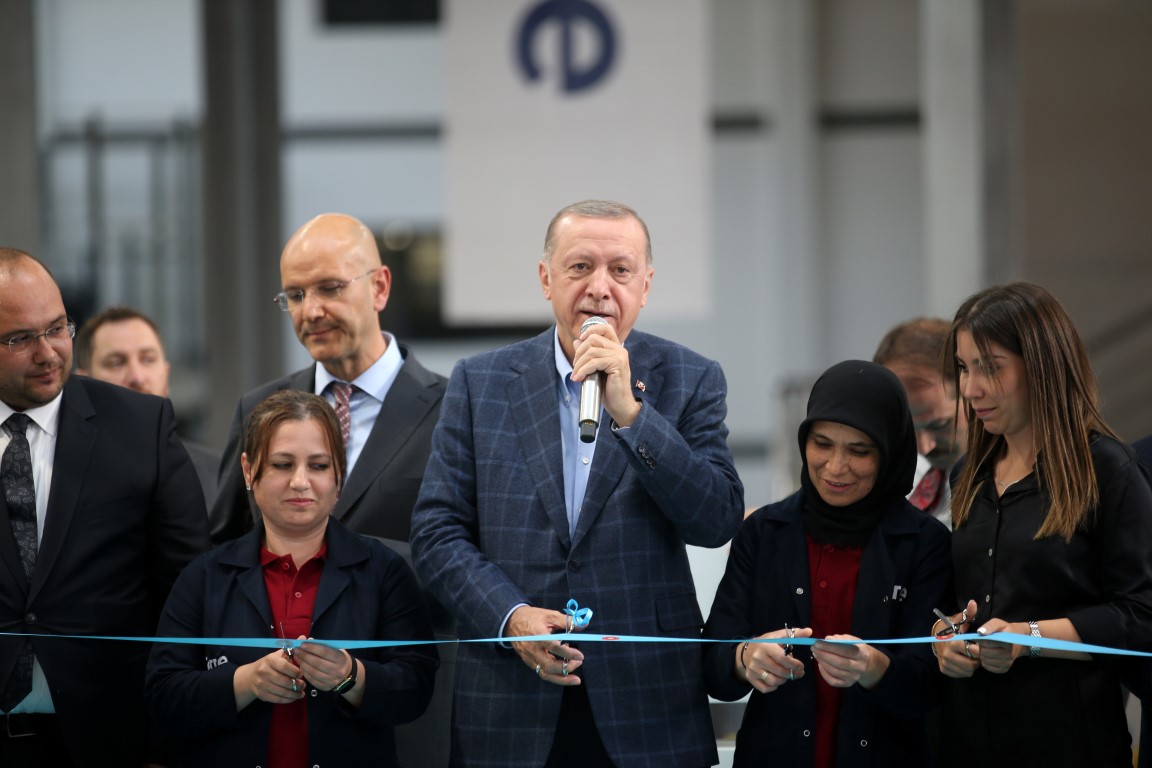 Toplu açılış ve temel atma töreninde sevgi seliyle karşılaşan Başkan Erdoğan'ın bir pankart dikkatini çekti.