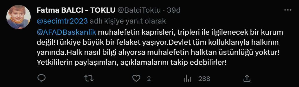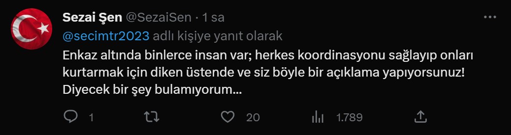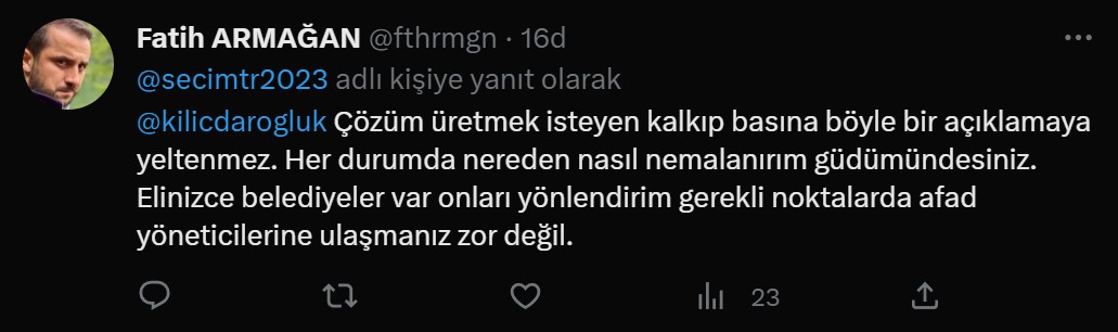 "Çözüm üretmek isteyen kalkıp basına böyle bir açıklamaya yeltenmez. Her durumda nereden nasıl nemalanırım güdümündesiniz. Elinizce belediyeler var onları yönlendirim gerekli noktalarda afad yöneticilerine ulaşmanız zor değil."