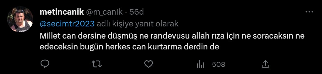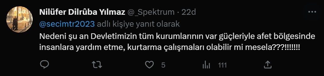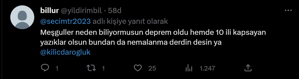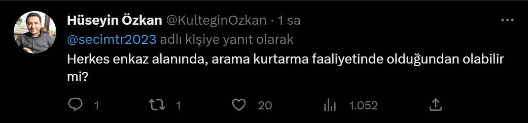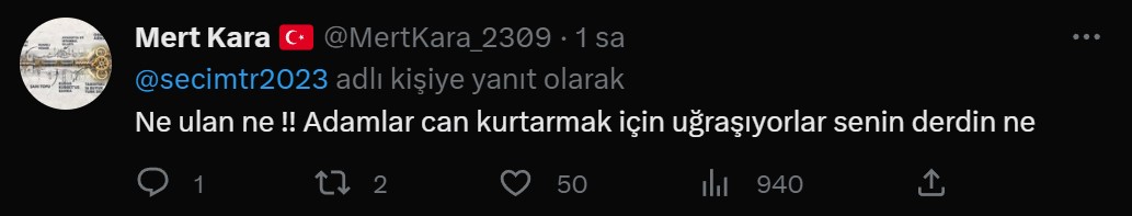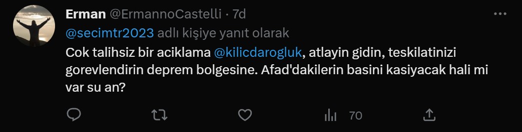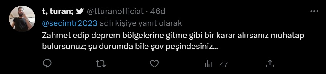 Türkiye Kahramanmaraş'ta meydana gelen 7.7 ve 7.6'lık depremlerle sarsıldı. Tüm ülkeyi derinden etkileyen elim olayda şu ana kadar 10 farklı ile 1541 can kaybı, 9 bin 733 yaralı, 3 bin 471 yıkılan bina var. Deprem sonrası kamera karşısına geçen CHP Genel Başkanı Kemal Kılıçdaroğlu, sahada enkaz altında kalan vatandaşları kurtarabilmek için canla başla mücadele eden AFAD'ı hedef aldı. "AFAD'tan randevu talebinde bulundum, şu ana kadar bir geri dönüş olmadı. Nedenini gayet iyi biliyorum" diyen Kılıçdaroğlu'na taraflı tarafsız birçok vatandaş tepki gösterdi. CHP liderine yönelik gelen tepkilerden bazıları, "'Bu durumda bile hâlâ saçma sapan alttan alta mesajlar vermek çok yersiz! İnsanlar canıyla boğuşuyor canıyla' , ' Selden kütük kapma peşinde. Kalkmış belediye icraatlarını anlatıyor. Bunadın mı ne yaptın sen ya?' , 'Ne randevusu ya millet can derdinde bu da randevu falan istiyor.'" şeklinde oldu. Yaşananlar sonrasında Kılıçdaroğlu, AFAD Genel Merkezi'ne davet edildi ve yetkililerden bilgi aldı.