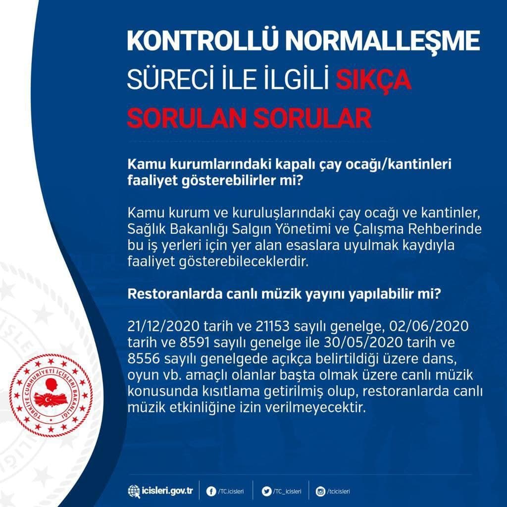 İçişleri Bakanlığı, milyonların kontrollü normalleşme süreciyle ilgili takıldıkları konulara açıklık getirdi. Vatandaşların İçişleri Bakanlığı'na yönelttiği sorular, 12 madde halinde cevaplandı. Bakanlık "Dernek lokalleri genelgeye tabi mi?", "Lokanta, kahvehane ve kafelere HES kodu ile mi girilecek?", "Kahvehanelerde oyun oynanabilecek mi?" gibi soruları yanıtladı.