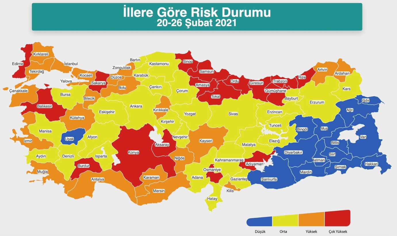 Veriler analiz edildiğinde düşük ve orta risk gruplarında normalleşme adımları atılacak olsa da rehavete kapılınmaması gerekliliği ortaya çıkıyor. 11 il daha yüksek risk grubuna geçmeye yakın. Sağlık Bakanlığı'nın iki haftalık değerlendirmeleriyle güncel risk gruplarına göre iyileşme olan illerde tedbirler esnetilecek, yükseliş olduğu takdirde ise artırılacak.