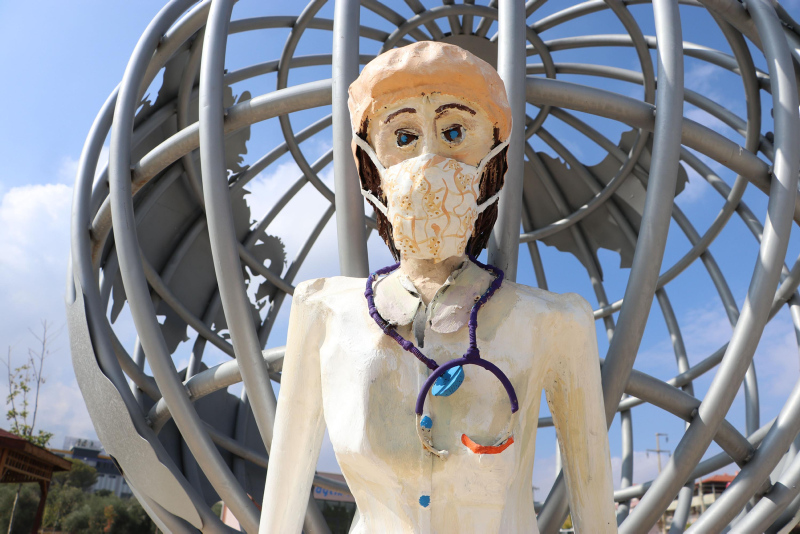 Sağlık çalışanlarını yansıtan heykellerin mimari yapısını eleştiren Aki, "2 yıldır süren bir pandemi dönemi içerisindeyiz. Bir virüsle savaş halindeyiz.